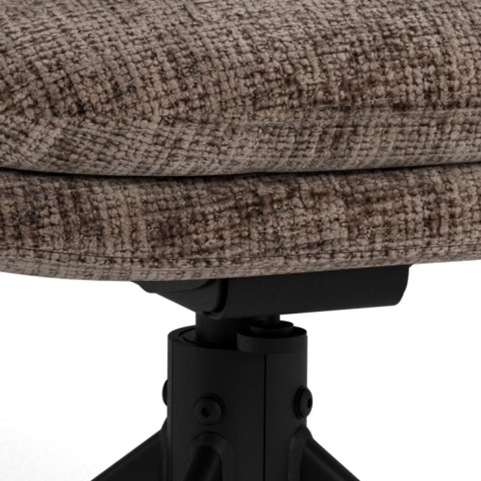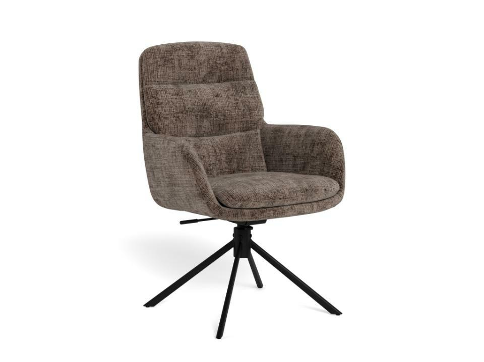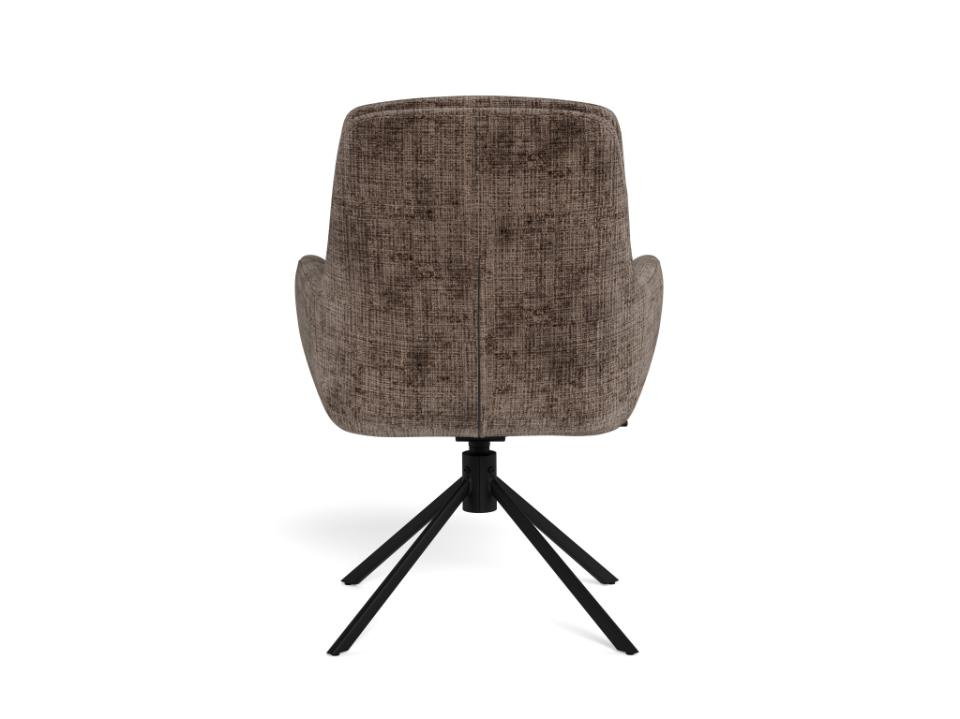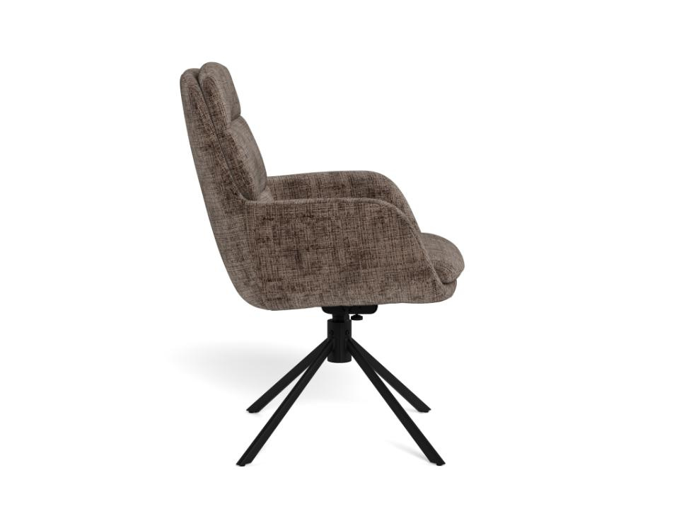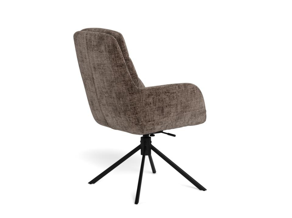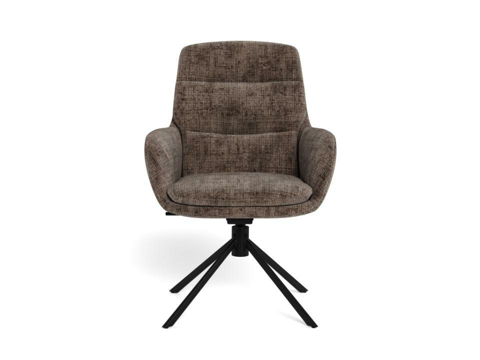 Krzesło Edgar marki Actona to loftowe krzesło obrotowe do jadalni, tapicerowane w eleganckim brązowym kolorze, osadzone na czarnej stalowej podstawie. Wysokie oparcie, wygodne podłokietniki oraz funkcja odchylenia zapewniają komfort przy stole, a nowoczesna forma świetnie dopełnia aranżacje jadalni, salonu lub kuchni.