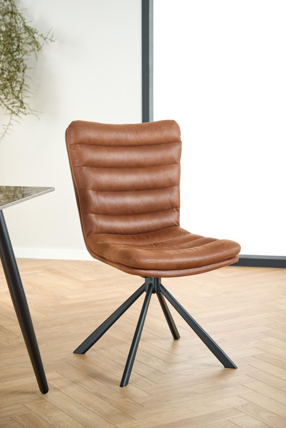 Brązowa ekoskóra ociepla aranżację i dobrze współgra z drewnem, cegłą, grafitem czy czernią. To idealne krzesło do jadalni i krzesło do salonu w jednym – sprawdzi się przy dużym stole, pomocniczym stoliku, a nawet przy biurku w pokoju młodzieżowym.