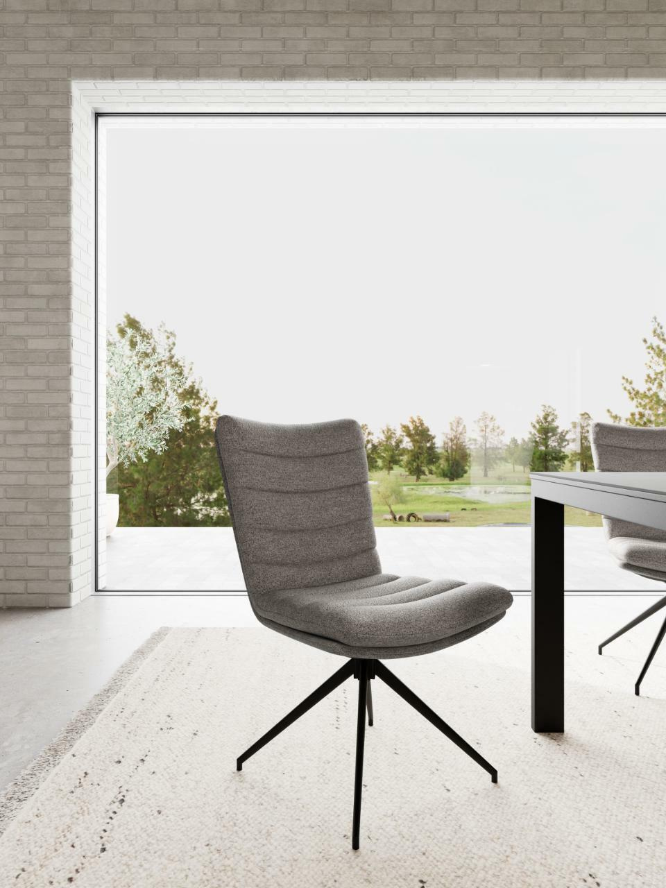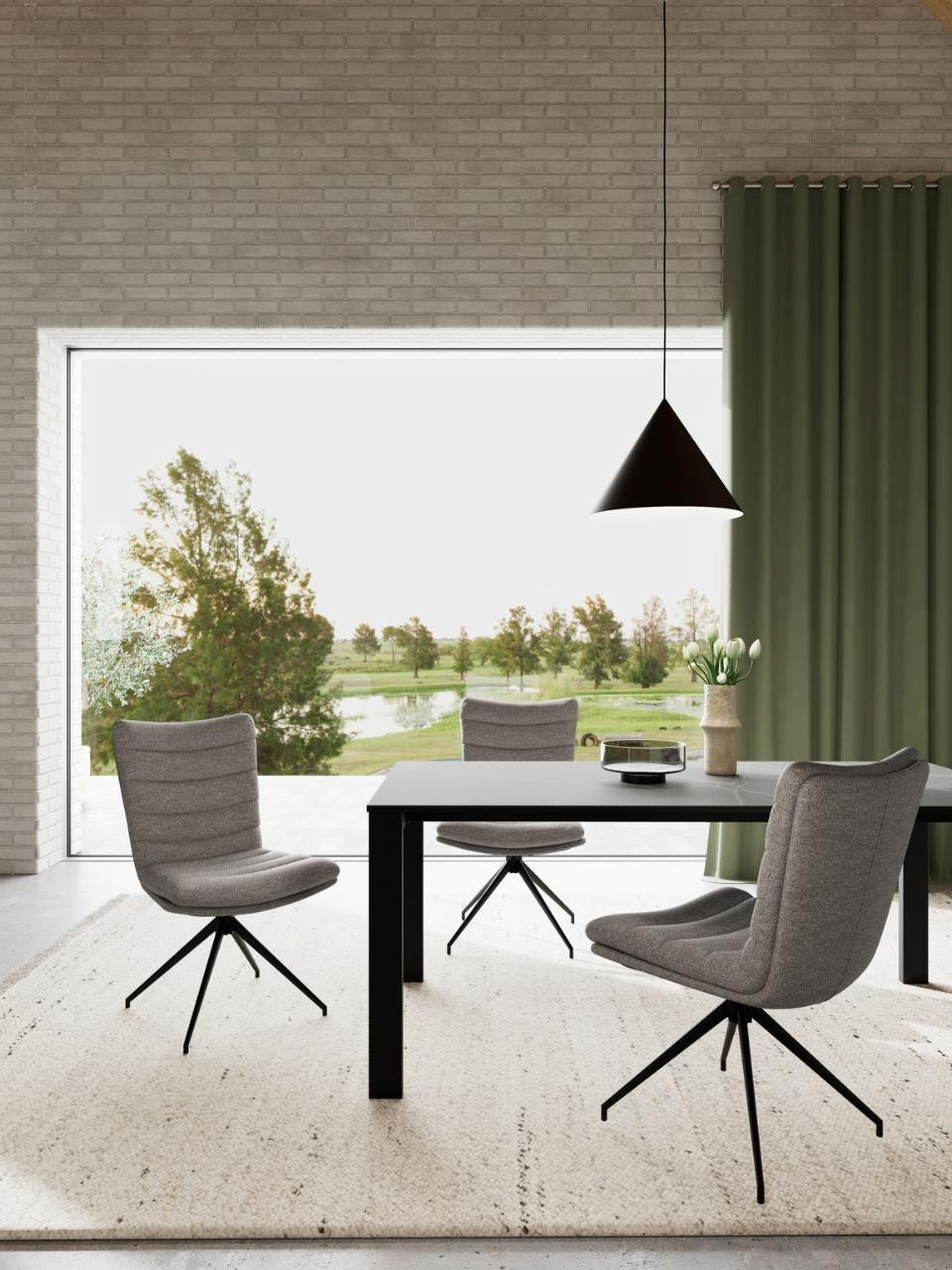 Krzesło tapicerowane Grafton marki Actona to nowoczesne, szare krzesło obrotowe o wysokości 96,5 cm, zaprojektowane z myślą o codziennym użytkowaniu przy stole w jadalni, w kuchni lub w salonie. Miękkie siedzisko z komfortową pianką oraz stabilna, czarna podstawa na 4 nogach tworzą wygodne i funkcjonalne krzesło do jadalni, które sprawdzi się zarówno przy rodzinnych posiłkach, jak i podczas pracy przy domowym biurku.