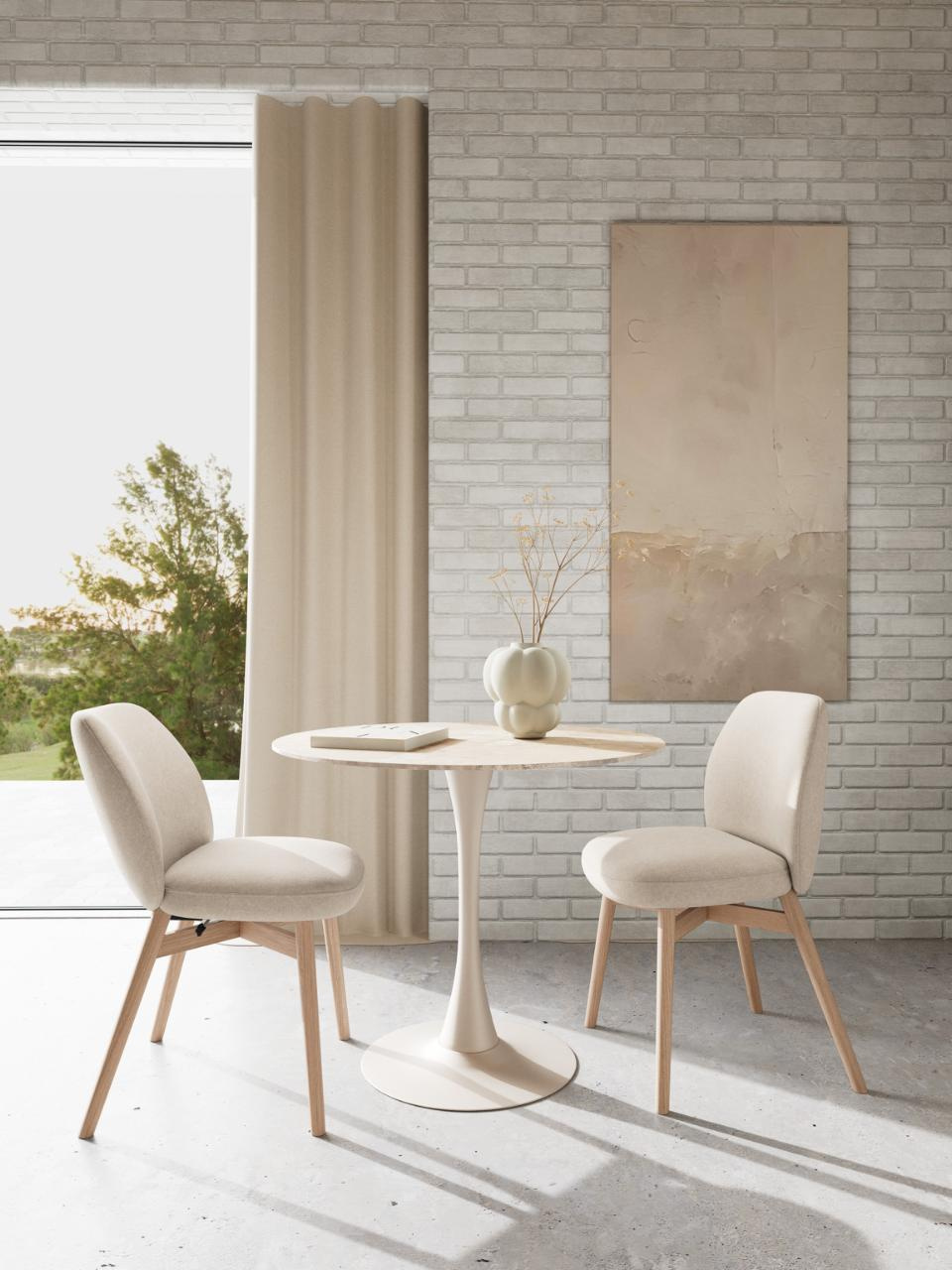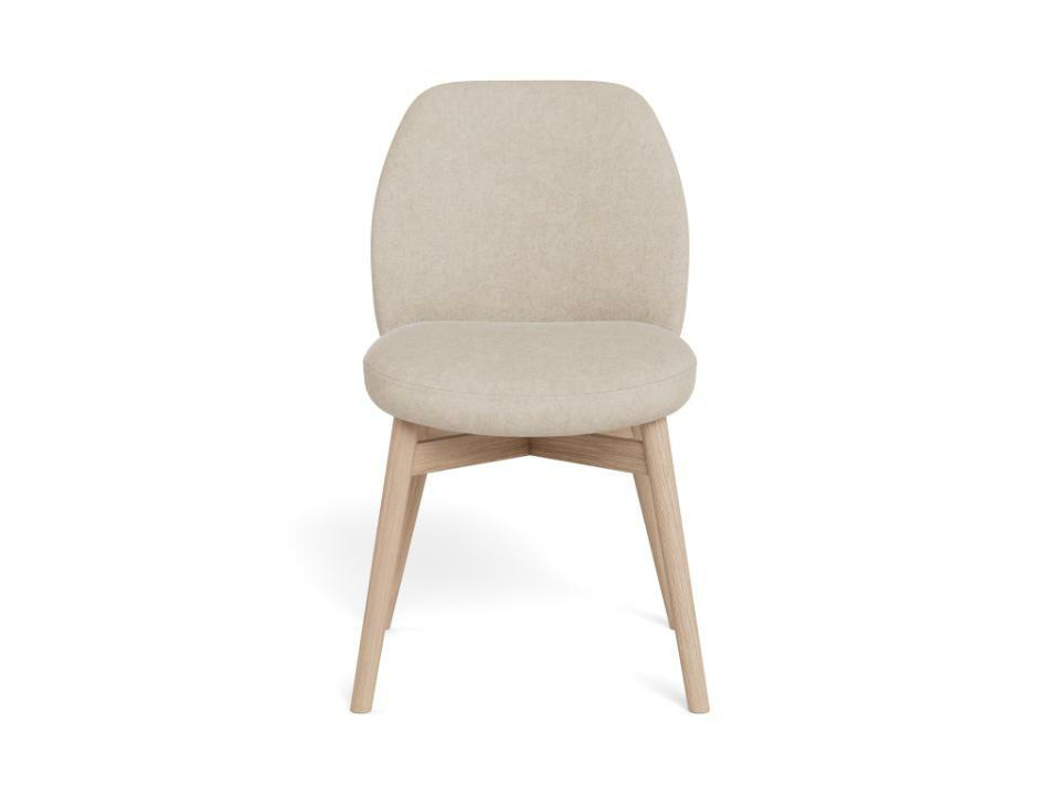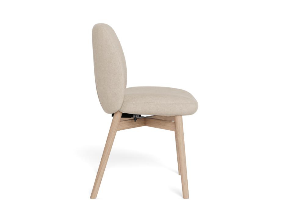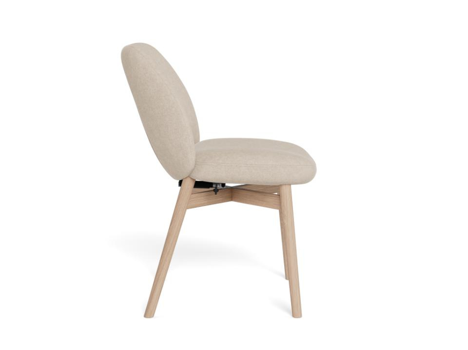 Neutralny beżowy kolor tapicerki i jasny dąb bielony powodują, że Joy bez trudu dopasuje się do różnych stołów: białych, drewnianych, a nawet czarnych w nowoczesnej jadalni. Świetnie współgra z wnętrzami skandynawskimi, nowoczesnymi i przytulnymi aranżacjami w stylu japandi. Dzięki kompaktowym wymiarom (głębokość 56 cm) krzesło dobrze sprawdzi się także w mniejszej kuchni czy aneksie.