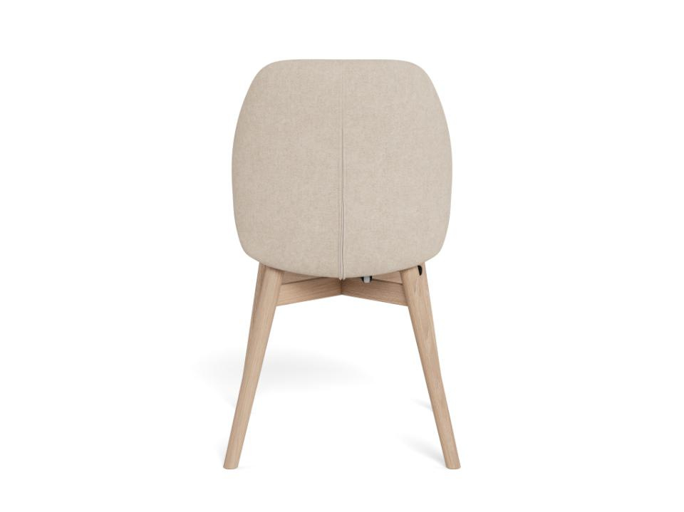 Podstawa krzesła wykonana jest z naturalnego drewna dębowego w kolorze dąb bielony, osadzonego na czterech stabilnych nogach. Taka konstrukcja zapewnia nośność do 110 kg, dzięki czemu krzesło sprawdzi się w intensywnie użytkowanych jadalniach i kuchniach. Matowe wykończenie podkreśla rysunek drewna, dodając wnętrzu przytulności i elegancji, a jednocześnie jest praktyczne – drobne zabrudzenia i ślady użytkowania są mniej widoczne niż na wysokim połysku.