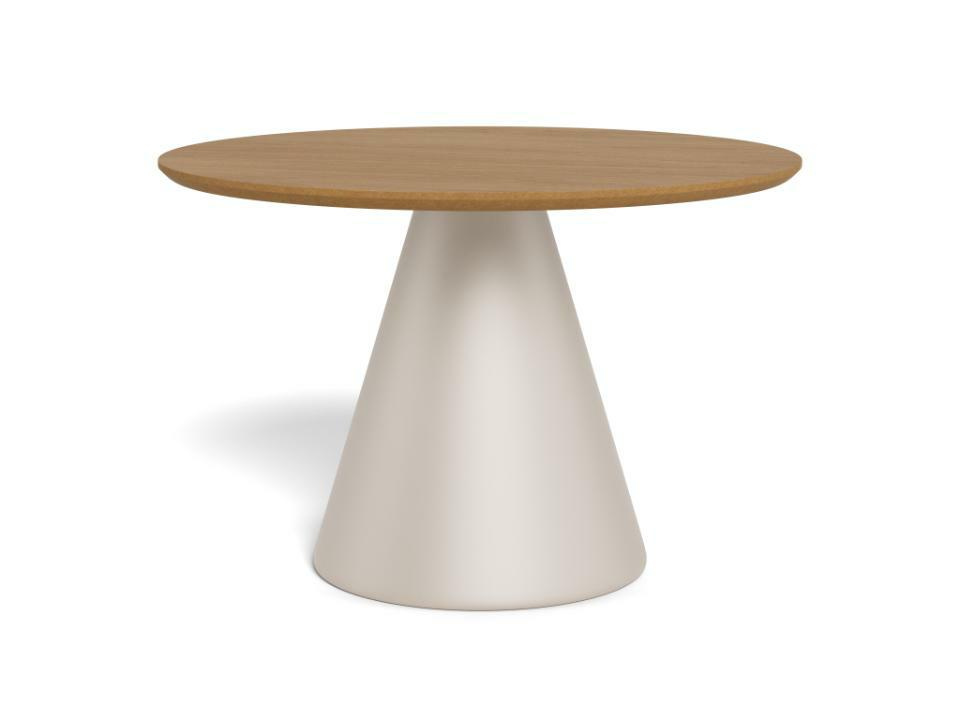 Stolik kawowy Soli utrzymany jest w spójnym, nowoczesnym stylu. Zamiast klasycznych czterech nóg ma jedną, szeroką podstawę o formie kolumny, która nadaje mu stabilność i oryginalny wygląd. Metalowa podstawa w beżowym odcieniu subtelnie koresponduje z dębowym blatem, tworząc spójną, spokojną kolorystykę idealną do wnętrz nowoczesnych i skandynawskich. To mebel, który nie dominuje przestrzeni, ale stylowo ją dopełnia.