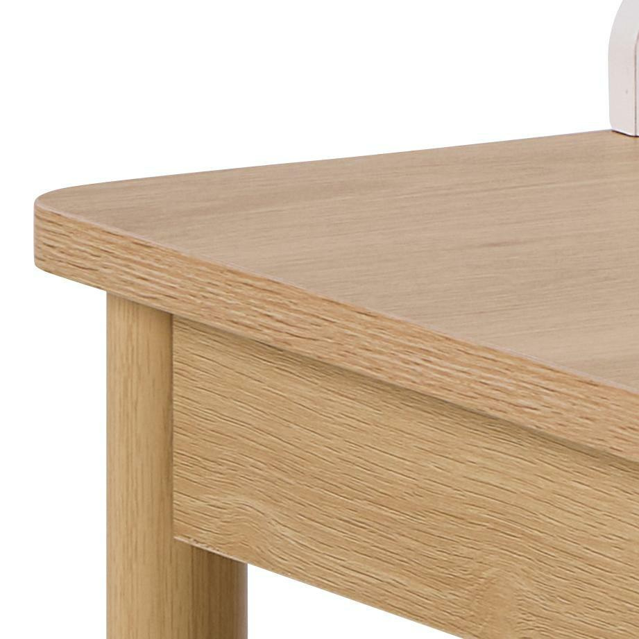 Biurko Alpena łączy prostą, prostokątną formę z ciepłym odcieniem naturalnego dębu, dzięki czemu tworzy przytulne, ale wciąż nowoczesne miejsce do nauki i pracy. Delikatnie zaokrąglone krawędzie sprawiają, że mebel wygląda lekko i bezpiecznie, co ma znaczenie w codziennym użytkowaniu przez nastolatka. Neutralna kolorystyka naturalnego drewna pasuje zarówno do jasnych, jak i ciemniejszych aranżacji, a biurko harmonijnie wkomponuje się w typowe wnętrze w stylu skandynawskim.