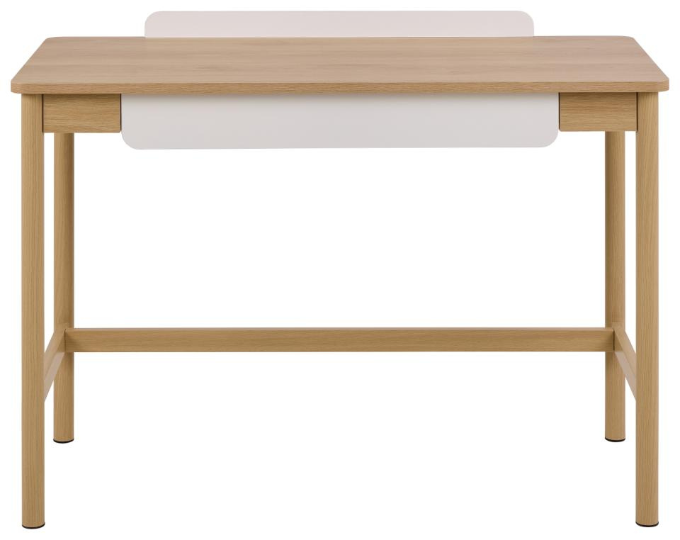 Biurko Alpena marki Actona to kompaktowe biurko skandynawskie o szerokości 110 cm, wykonane z laminowanego blatu w kolorze naturalnego dębu oraz stabilnej metalowej podstawy. Wyposażone w praktyczną szufladę i wykończone w macie, idealnie sprawdzi się jako biurko młodzieżowe lub małe biurko do pracy i nauki w domowym pokoju.