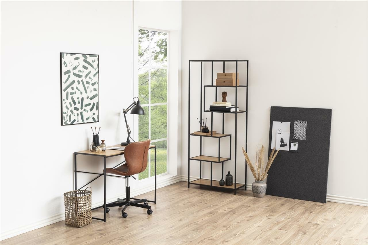 Biurko Seaford wykonane zostało z metalu malowanego proszkowo na kolor czarny oraz płyty MDF wykończonej laminatem w kolorze dębu. Loftowy charakter i prostota wykonania to coś co wyróżnia serię mebli Seaford. Biurko wprowadzi surowy klimat oraz sprawdzi się w mniejszych pomieszczeniach dzięki swoim wymiarom.
