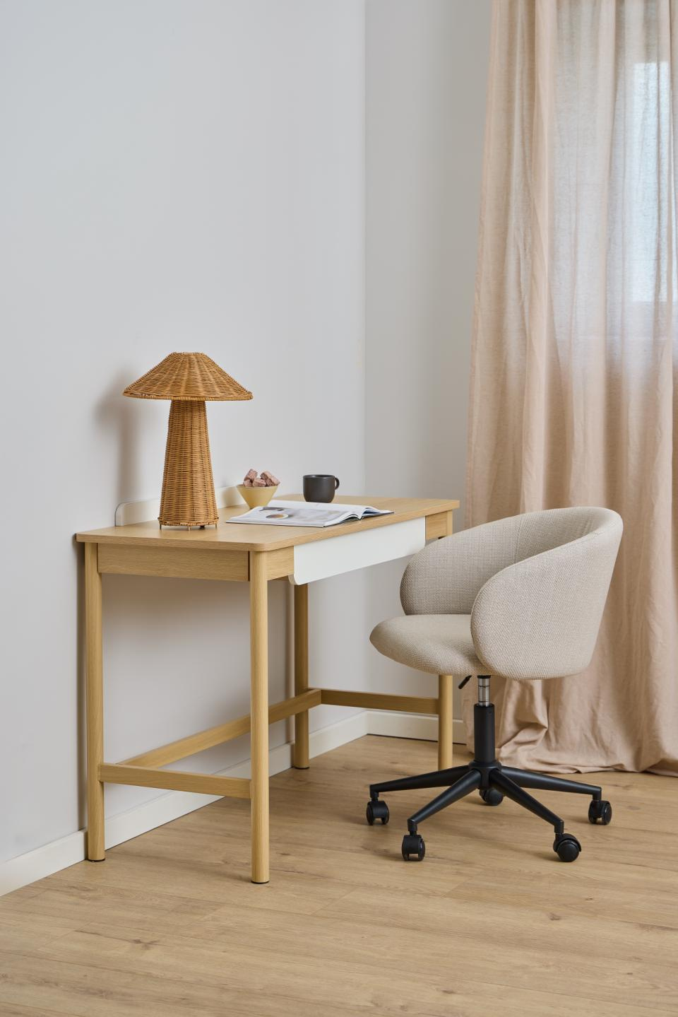 Nowoczesna, matowa podstawa na kółkach w czarnym kolorze tworzy z beżowym siedziskiem ponadczasowe połączenie, które łatwo dopasujesz do różnego wystroju – od minimalistycznego biura po przytulny gabinet. Fotel biurowy obrotowy Eleanor dobrze sprawdzi się także jako wygodne krzesło biurowe do komputera w pokoju nastolatka, łącząc funkcję fotela do nauki i relaksu przy biurku.