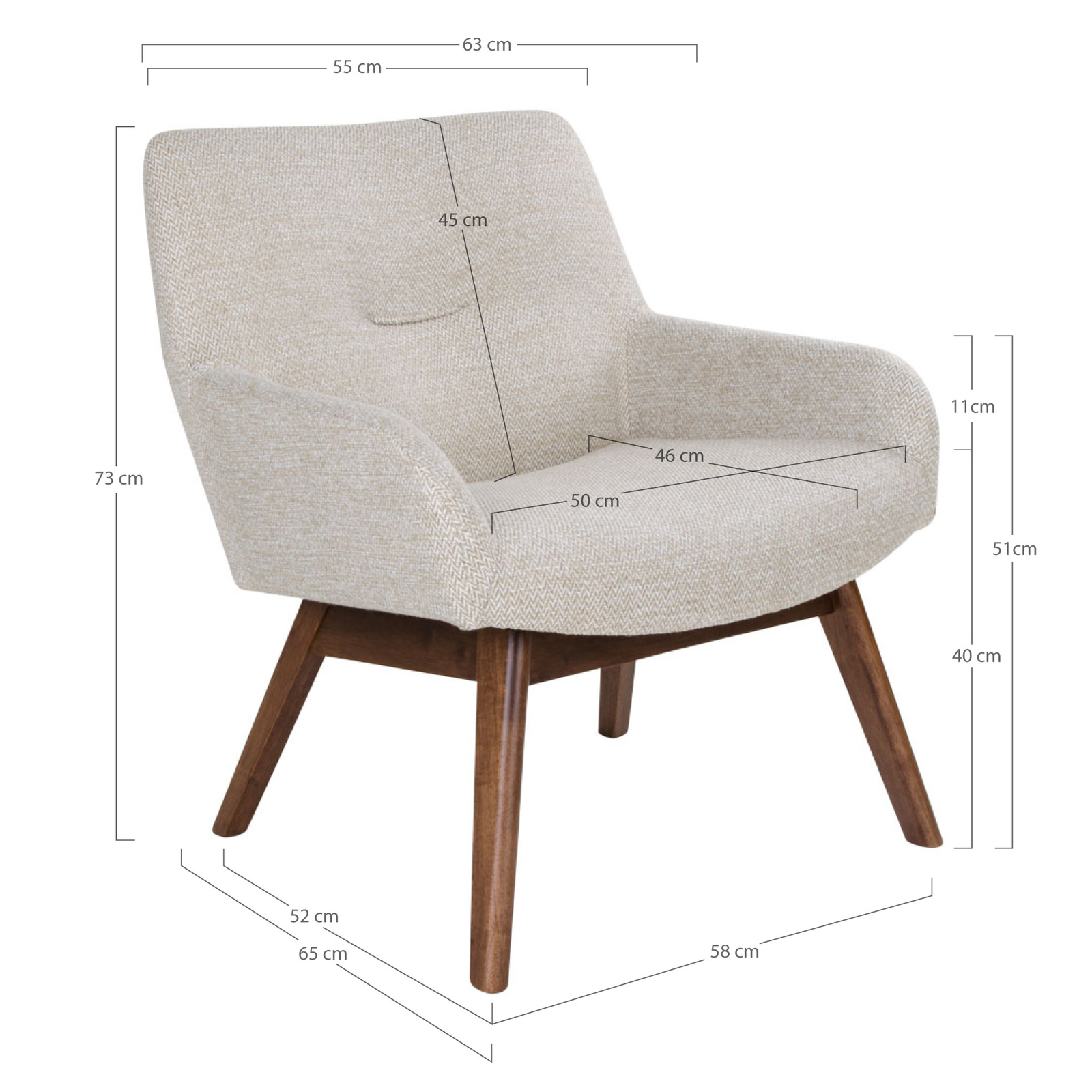 Fotel wypoczynkowy London marki Intesi to połączenie skandynawskiego minimalizmu z klasyczną elegancją, idealne do salonu lub domowego gabinetu. Szerokie siedzisko w odcieniu beżowym, tapicerowane przyjemną w dotyku tkaniną, osadzone jest na solidnej, drewnianej podstawie w kolorze orzecha. Podłokietniki oraz ergonomiczne oparcie zapewniają wygodę podczas dłuższego wypoczynku, a kompaktowe wymiary (wysokość 73 cm, szerokość 63 cm, głębokość 65 cm) pozwalają dopasować fotel zarówno do przestronnych, jak i mniejszych wnętrz.
