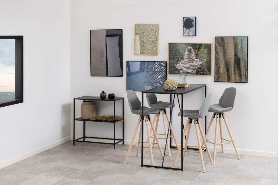 Hoker Oslo marki Actona to nowoczesny stołek barowy z oparciem, zaprojektowany w stylu skandynawskim. Łączy w sobie wygodne, tapicerowane szare siedzisko z jasną, drewnianą podstawą na czterech stabilnych nogach. Dzięki wysokości siedziska 77 cm jest idealny do kuchni, wyspy kuchennej czy domowego baru, zapewniając komfort i solidność na co dzień.