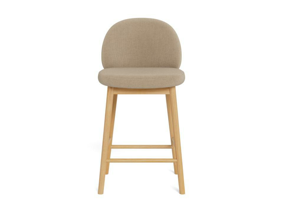 Hoker Sophia marki Actona to beżowe, tapicerowane krzesło barowe o wysokości siedziska 65 cm, stworzone z myślą o wygodnym użytkowaniu przy kuchennej wyspie lub wysokim blacie. Łączy miękkie siedzisko z tkaniny z solidną podstawą z drewna dębowego, tworząc funkcjonalny i elegancki mebel do nowoczesnej kuchni.