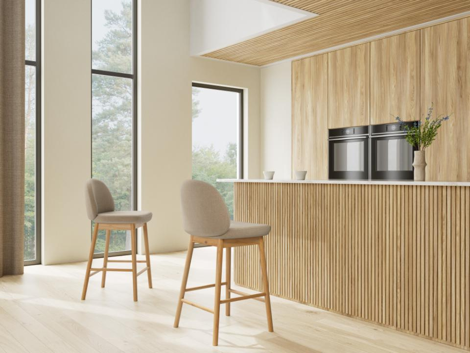 Profilowane oparcie i głębokie siedzisko (ok. 42–49,5 cm) zapewniają wygodną pozycję, nawet gdy śniadanie przedłuża się w rodzinne spotkanie. Wysokość siedziska 64,5 cm jest idealna do standardowych wysp kuchennych i blatów barowych o wysokości około 90 cm, dzięki czemu bez trudu dopasujesz hoker Sophia do swojej zabudowy. Miękka pianka pod tapicerką sprawia, że siedzi się wygodnie zarówno podczas szybkiej kawy, jak i dłuższych rozmów przy winie.