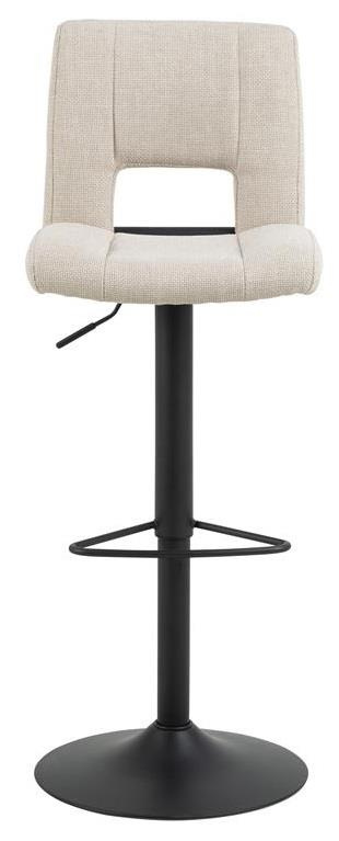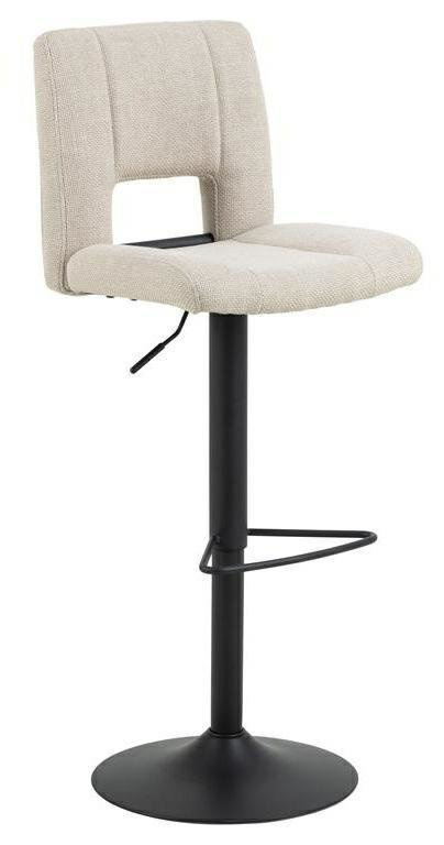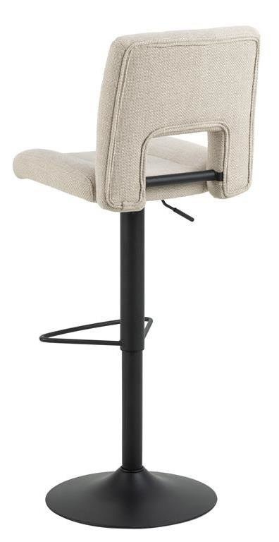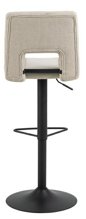 Tapicerowane siedzisko w kształcie litery L wykonane ze strukturalnej beżowej tkaniny, nie tylko wygląda stylowo, ale także zapewnia wsparcie dla ciała podczas siedzenia. Natomiast podstawa wykonana jest z matowego czarnego metalu w kształcie trąbki jest wyposażona w podnóżek, a także umożliwia regulację wysokości oraz obracanie, co zapewnia wygodę i elastyczność użytkowania. To połączenie stylu i wygody, które sprawi, że każde miejsce przy wyspie w jadalni stanie się jeszcze bardziej przyjemne i funkcjonalne.