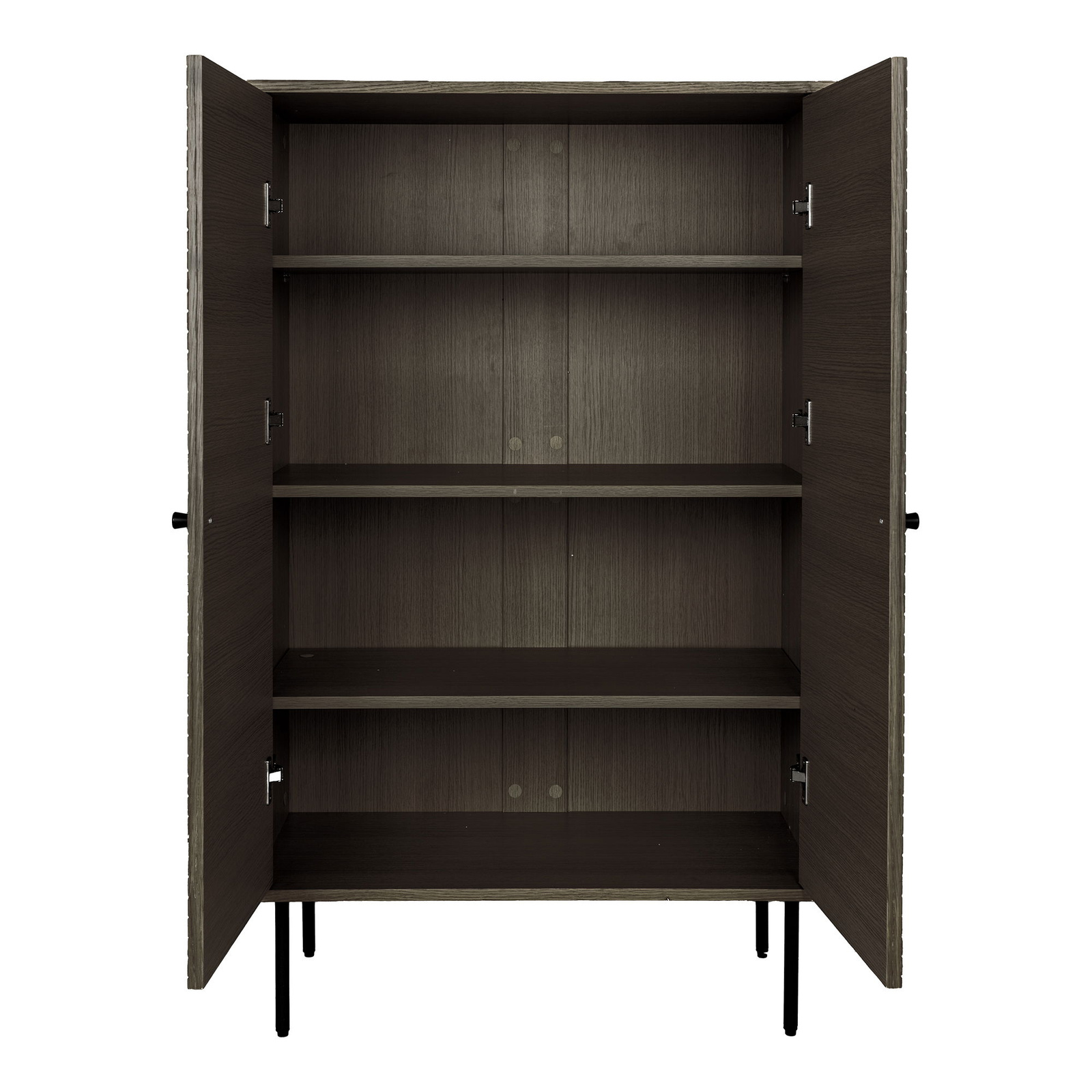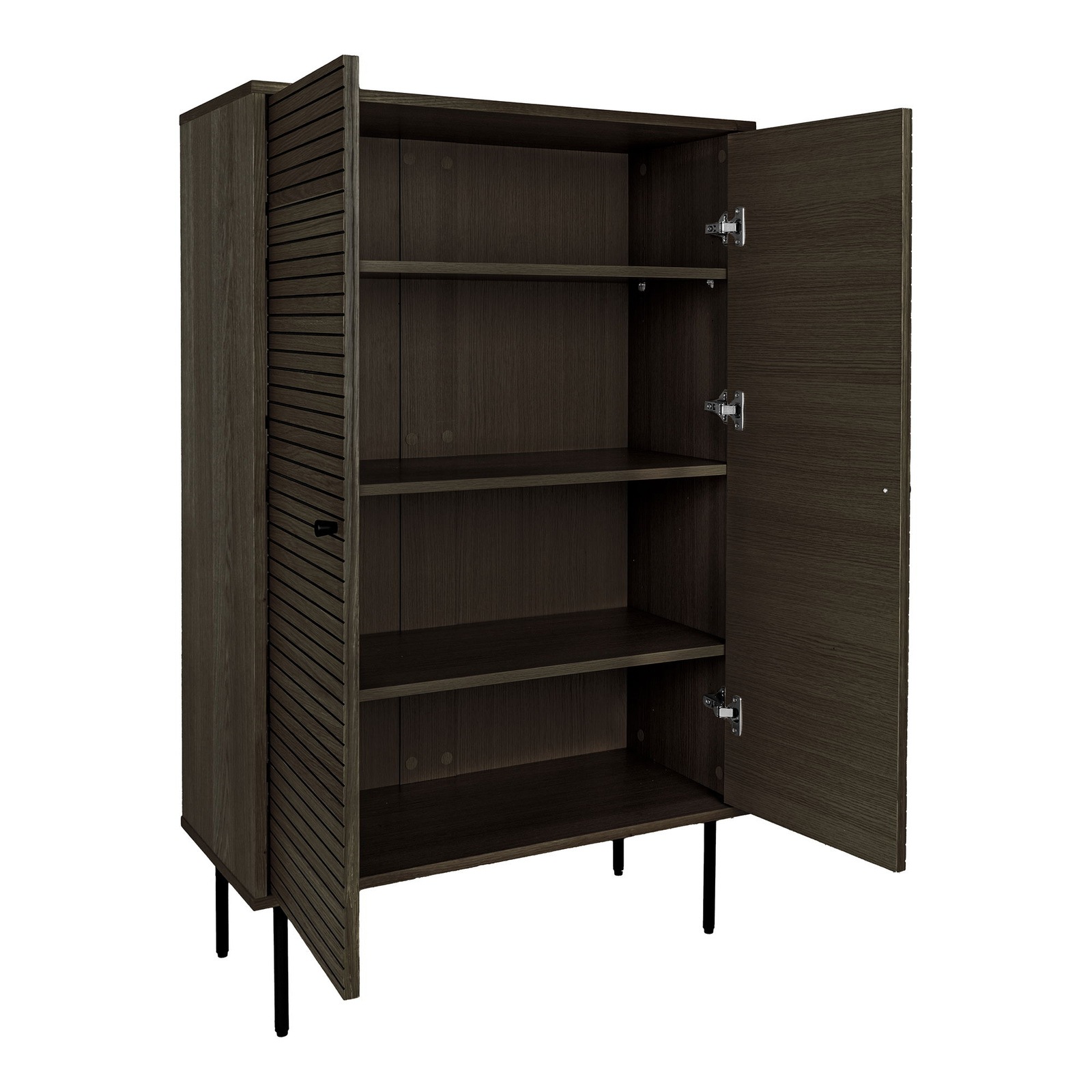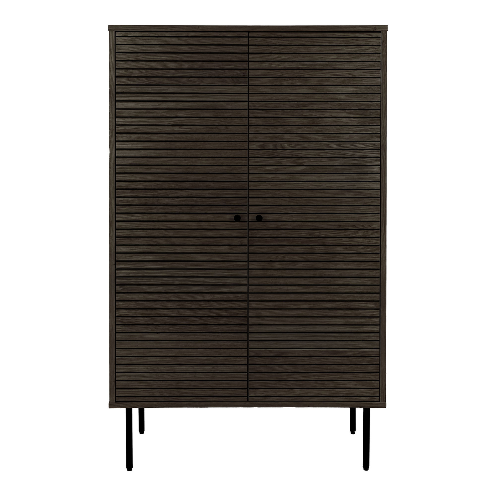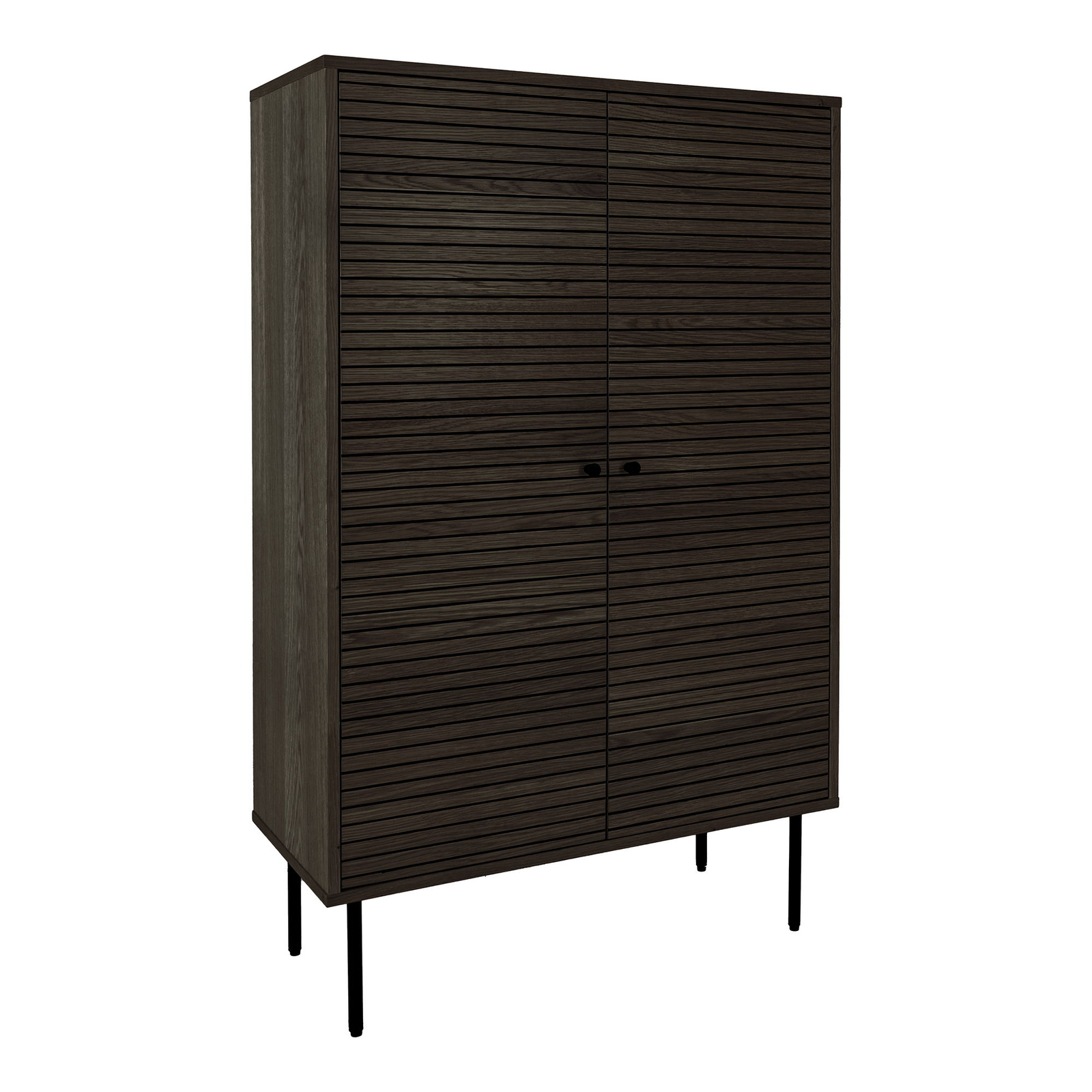 Komoda Kyoto marki House Nordic to wysoka, skandynawska komoda drewniana o szerokości 80 cm, wykończona forniren dębowym w dymionym odcieniu. Posiada ryflowane fronty, dwie pojemne szafki oraz czarne, wysokie stalowe nogi, dzięki którym mebel wygląda lekko i jest praktyczny w codziennym użytkowaniu.