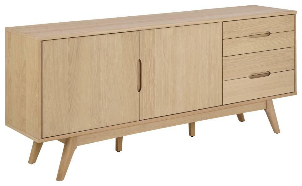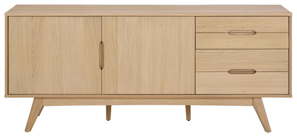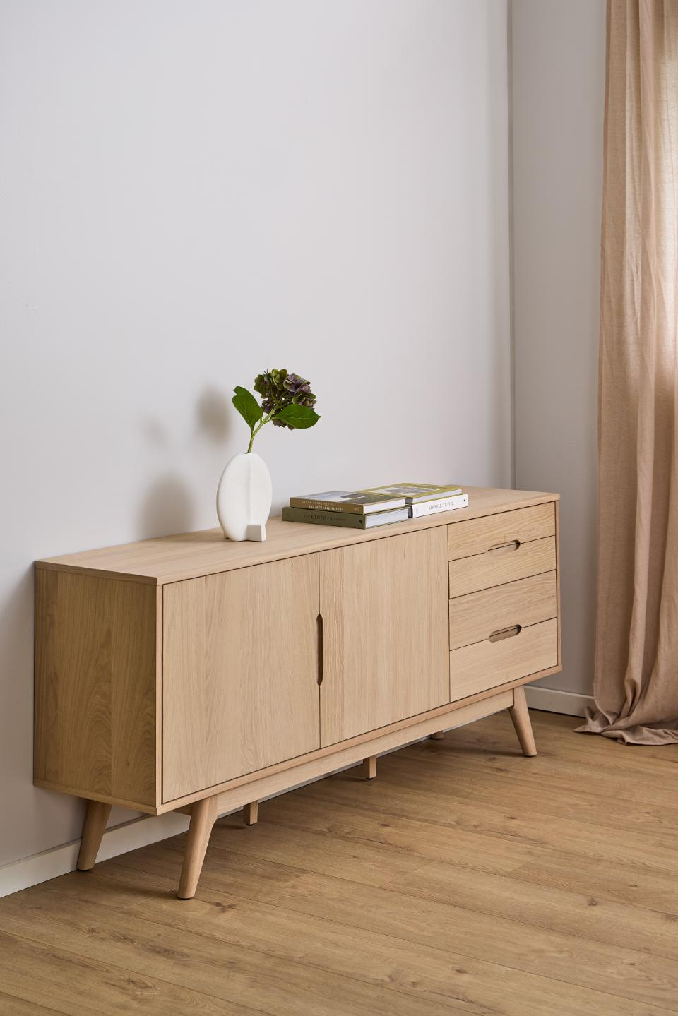 Komoda Marte marki Actona to skandynawska komoda o długości 180 cm, wykonana z naturalnego forniru dębowego olejowanego na biało. Łączy pojemne miejsce do przechowywania – 4 szuflady, 2 zamykane szafki z półkami – z lekką, ponadczasową formą na drewnianych nogach, idealną do salonu, jadalni czy sypialni.