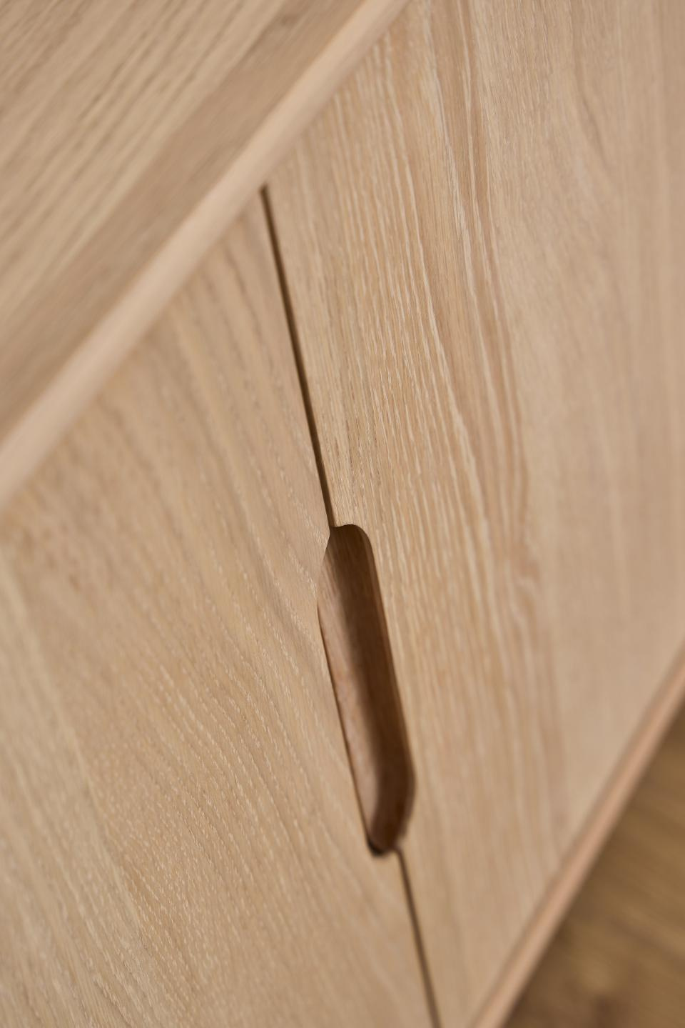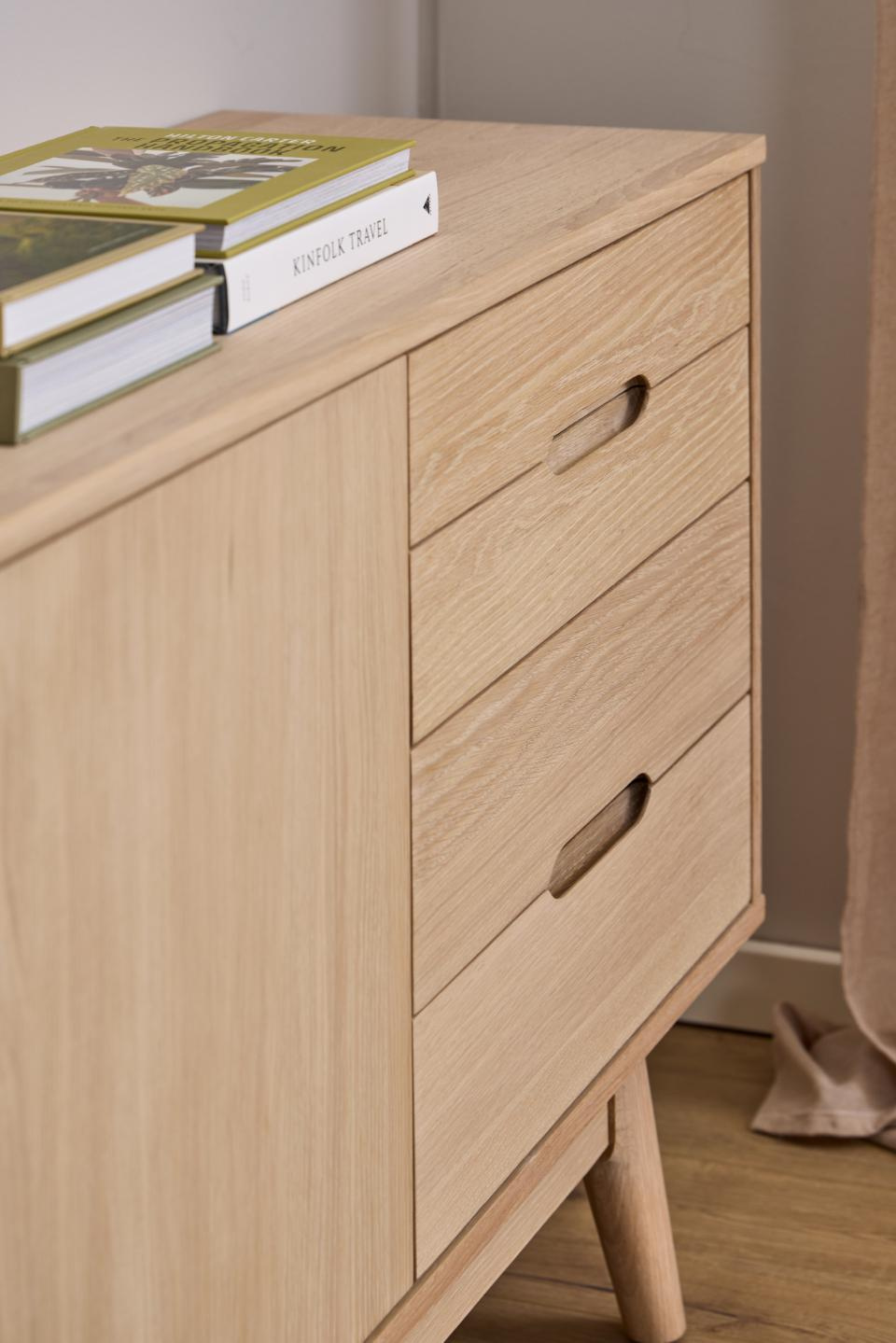 Fornir dębowy w jasnym, białym wybarwieniu dodaje wnętrzu świeżości i subtelnego, nordyckiego charakteru. Olejowane wykończenie podkreśla rysunek drewna, dzięki czemu każda komoda drewniana z tej serii ma swój indywidualny wygląd. Gładkie fronty bez zbędnych zdobień wpisują się w styl skandynawski – prosty, funkcjonalny, nastawiony na komfort codziennego użytkowania.