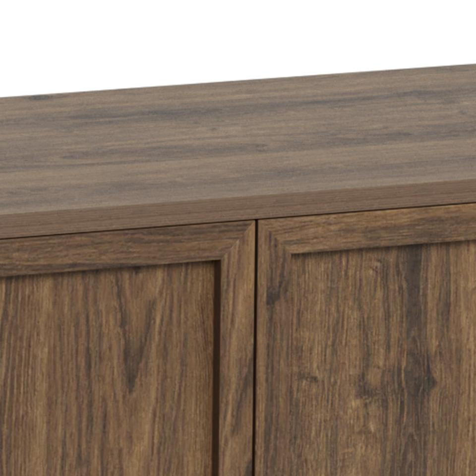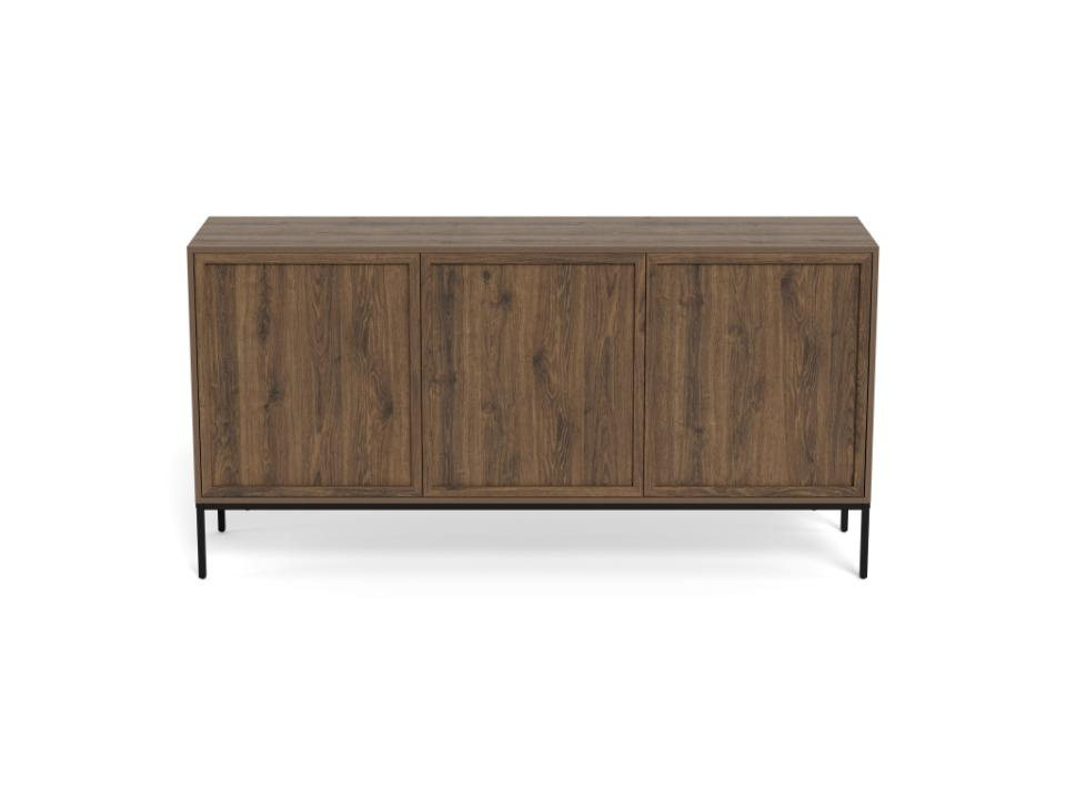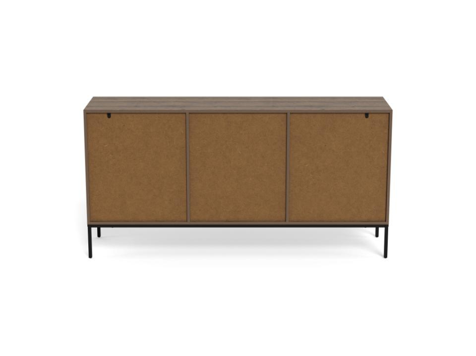 Wykończenie w kolorze dąb dymiony nadaje komodzie Palmdale elegancki, przytulny charakter, który świetnie wpisuje się w aranżacje nowoczesne i loftowe. Czarne, smukłe nogi ze stali wizualnie unoszą bryłę, dzięki czemu mebel wygląda lekko, nawet w mniejszym pomieszczeniu. Gładkie fronty bez zbędnych zdobień tworzą spokojną, uporządkowaną płaszczyznę, która dobrze komponuje się zarówno z jasnymi, jak i ciemnymi ścianami.