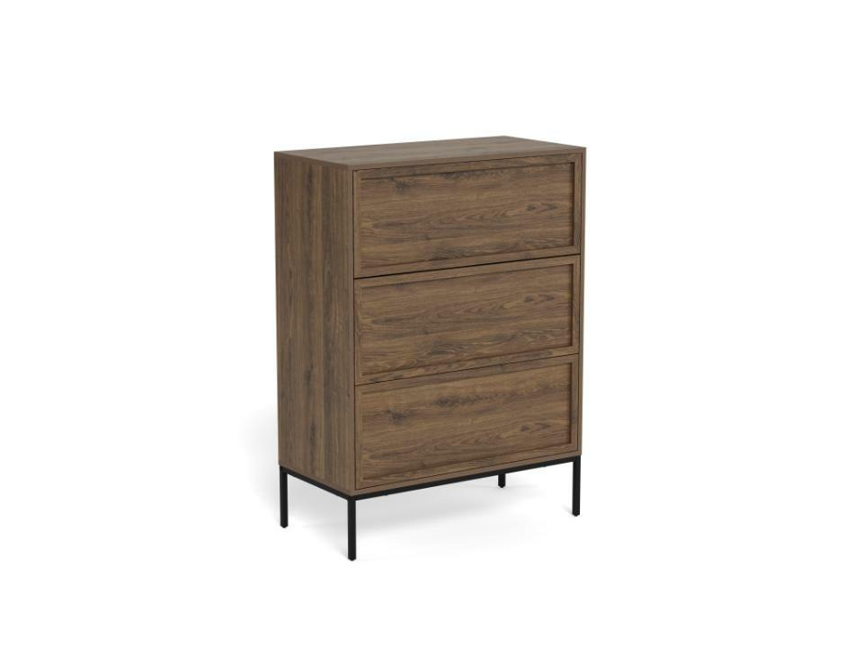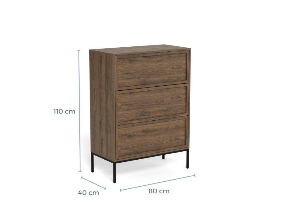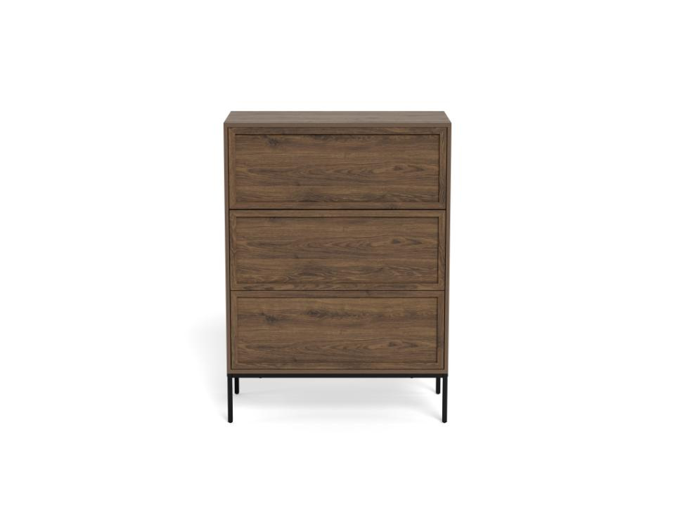 Komoda Palmdale marki Actona to wysoka, nowoczesna komoda z szufladami o wysokości 110 cm i szerokości 80 cm, która łączy ciepły odcień dębu dymionego z czarną, metalową podstawą. Trzy pojemne szuflady oraz smukłe nóżki tworzą elegancki mebel idealny jako komoda do salonu, sypialni czy stylowego przedpokoju.