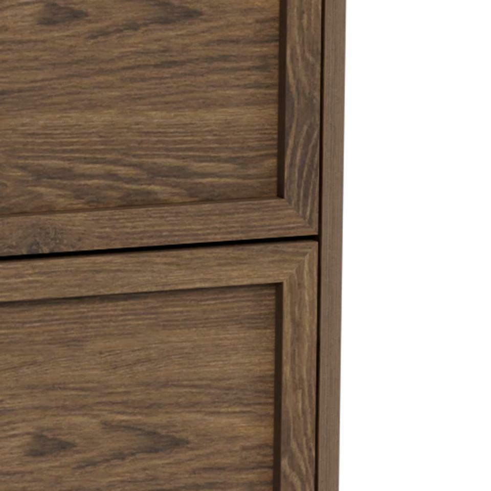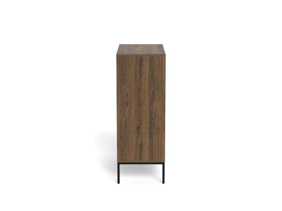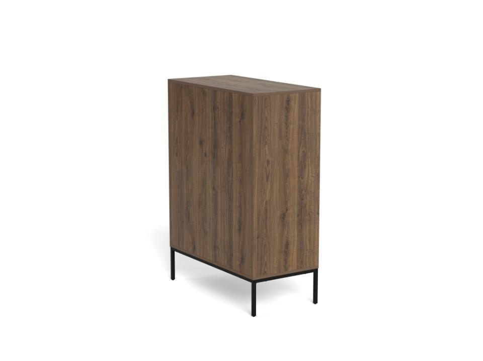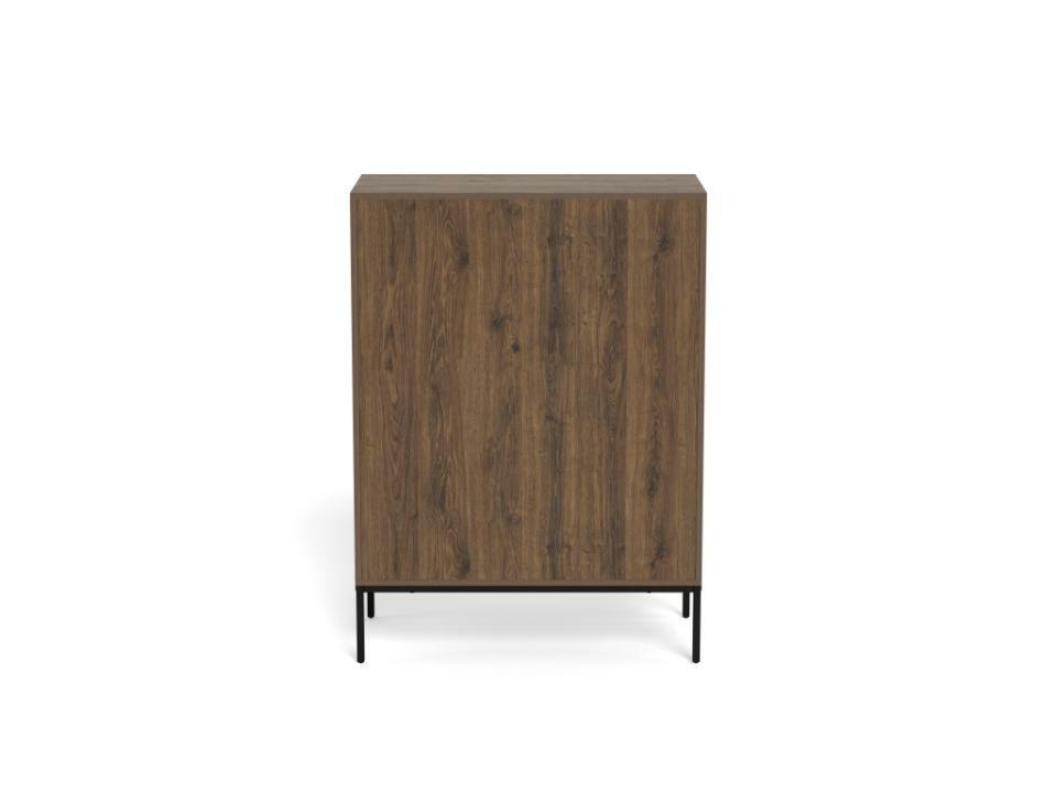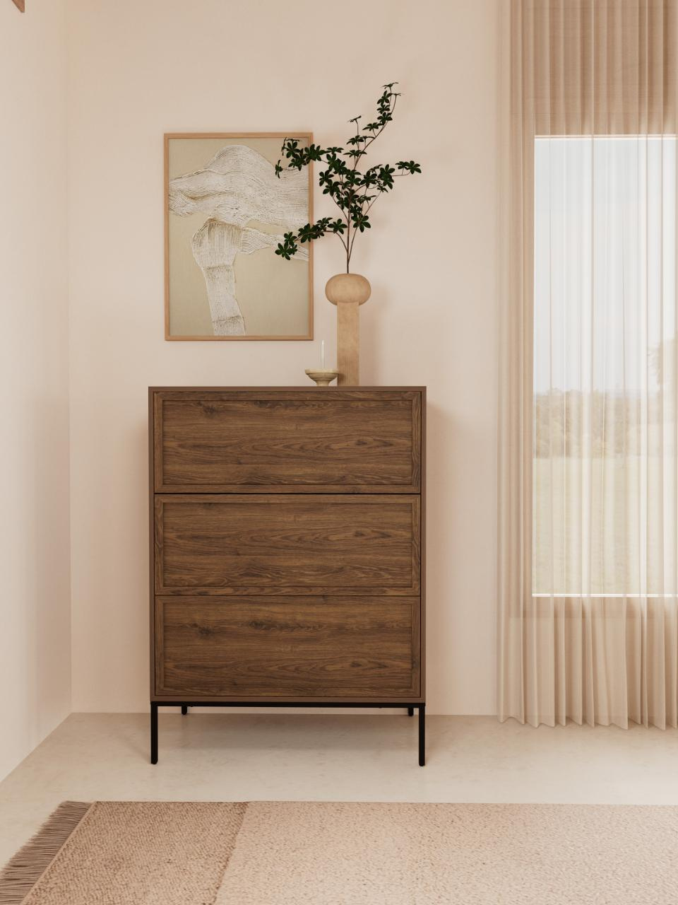 Wykończenie w kolorze dąb dymiony w połączeniu z czarną, stalową podstawą tworzy spójny, loftowy charakter. Ciepły odcień brązu ociepla aranżację, a prosta bryła i gładki front dodają wnętrzu elegancji. Smukłe, czarne nogi wprowadzają wizualną lekkość – komoda na nóżkach nie przytłacza przestrzeni, świetnie sprawdza się także w mniejszych pomieszczeniach, takich jak przedpokój czy kompaktowy salon.