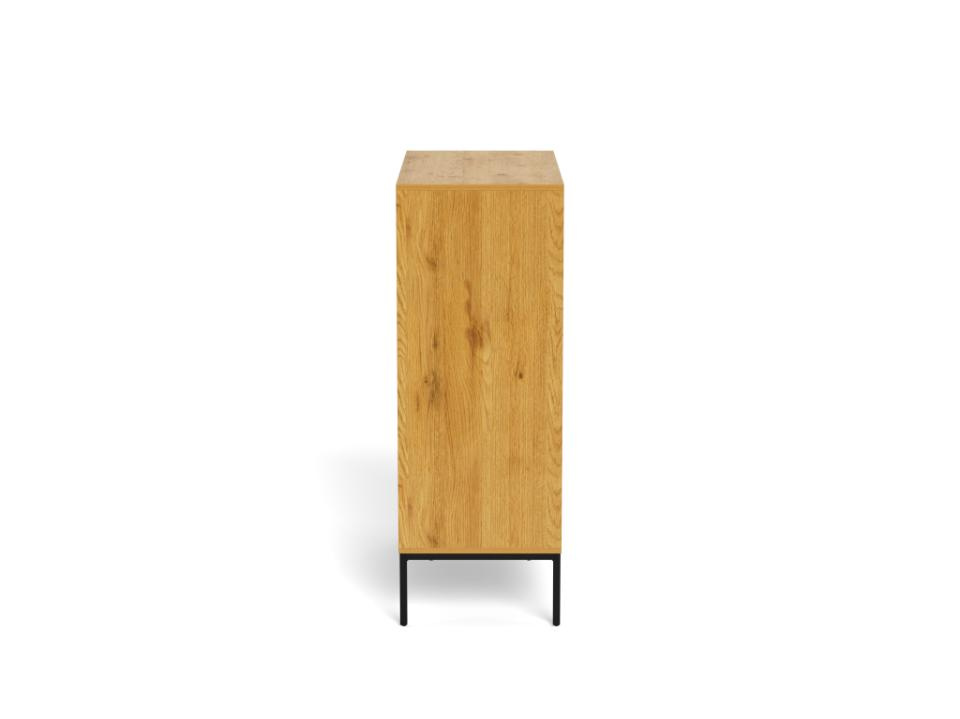 Blat i fronty w kolorze naturalnego dębu tworzą przytulne, ciepłe tło dla czarnej stalowej podstawy, co nadaje meblowi wyrazisty, loftowy charakter. Matowe wykończenie podkreśla nowoczesny styl i sprawia, że komoda świetnie komponuje się zarówno z jasnymi, jak i ciemnymi ścianami. Gładkie fronty bez uchwytów tworzą spójną, minimalistyczną płaszczyznę, która dobrze wygląda zarówno solo, jak i w zestawie z innymi meblami loftowymi.