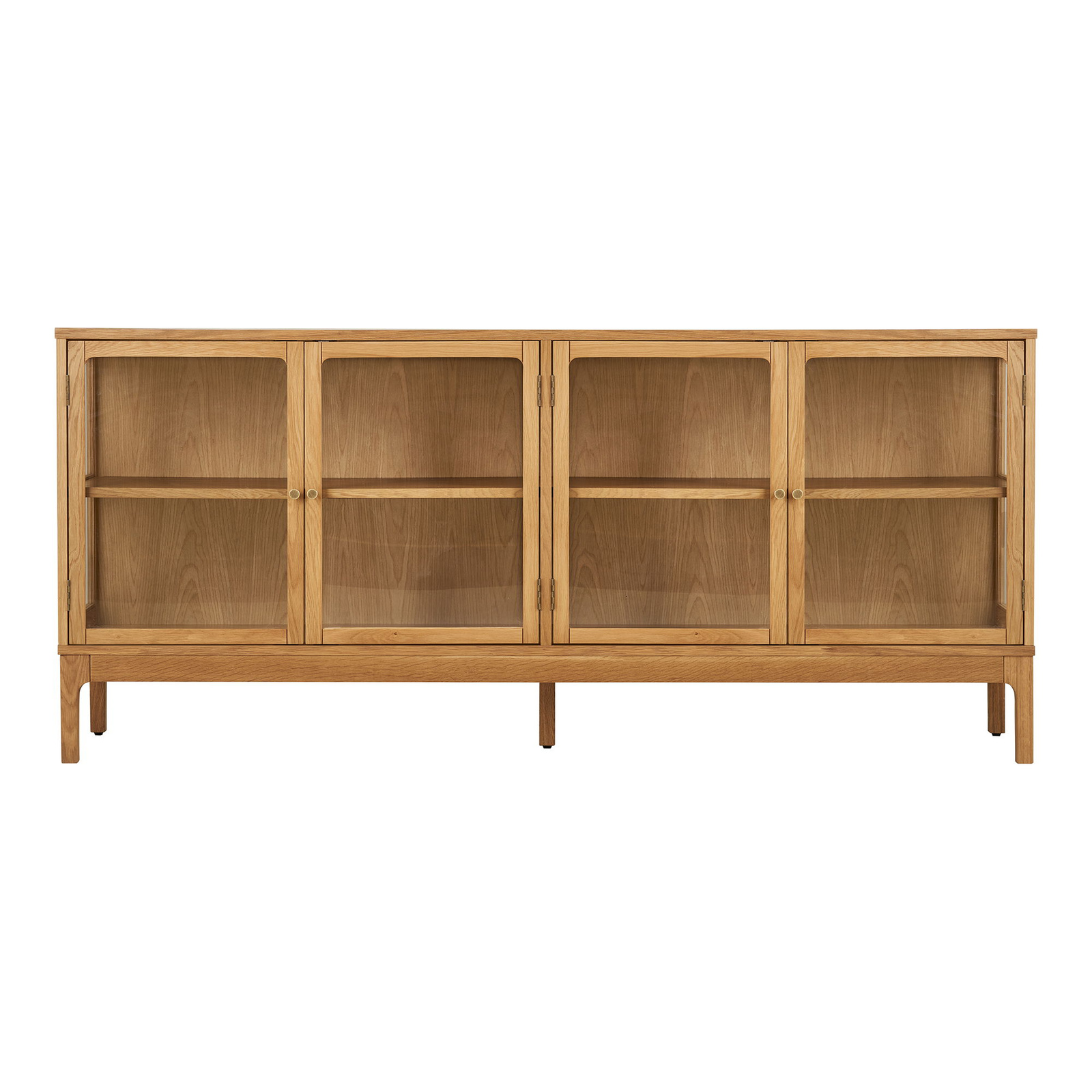 Wnętrze komody tworzą 4 oddzielne szafki z drzwiami, wyposażone w praktyczne półki. Dzięki długości 180 cm zyskujesz dużo miejsca na zastawę stołową, tekstylia, dokumenty czy akcesoria multimedialne. Przeszklone fronty pozwalają wyeksponować ulubione dekoracje, książki lub szkło – jednocześnie chroniąc je przed kurzem. To idealna komoda do salonu, jeśli chcesz połączyć funkcję domowego barku, witryny i schowka w jednym eleganckim meblu.