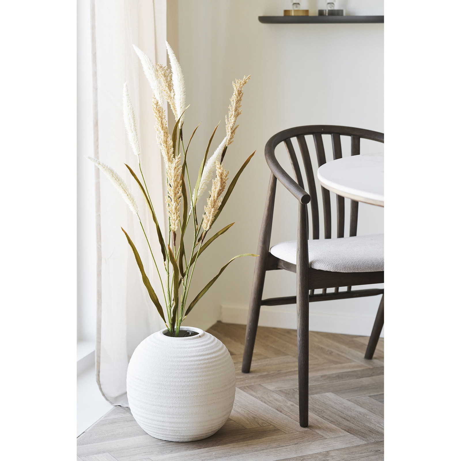 Czarny dąb o półmatowym wykończeniu nadaje krzesłu wyrazisty, nowoczesny charakter, a jednocześnie pozostaje na tyle stonowany, by łatwo dopasować je do różnych stołów i aranżacji. Stelaż z drewna dębowego wyróżnia się szlachetnym rysunkiem słojów, dzięki czemu każde krzesło jest nieco inne i nabiera unikalnego, naturalnego uroku. Piaskowa tapicerka na siedzisku i oparciu delikatnie ociepla całość, tworząc harmonijne połączenie idealne do współczesnych jadalni i salonów.