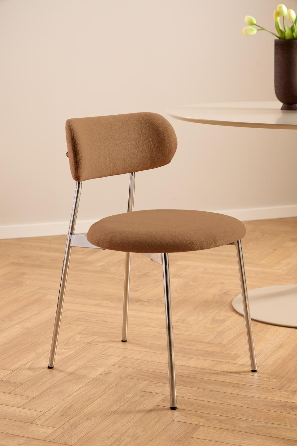 Krzesło Lyric Actona to nowoczesne krzesło tapicerowane do jadalni, które sprawdzi się również w kuchni otwartej na salon czy przy stole w strefie dziennej. Dzięki połączeniu ciepłego koloru terakoty z chłodnym chromem łatwo dopasujesz je zarówno do jasnych, skandynawskich aranżacji, jak i bardziej wyrazistych, współczesnych wnętrz.