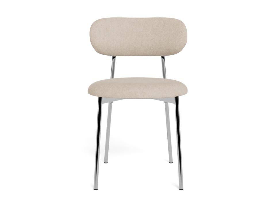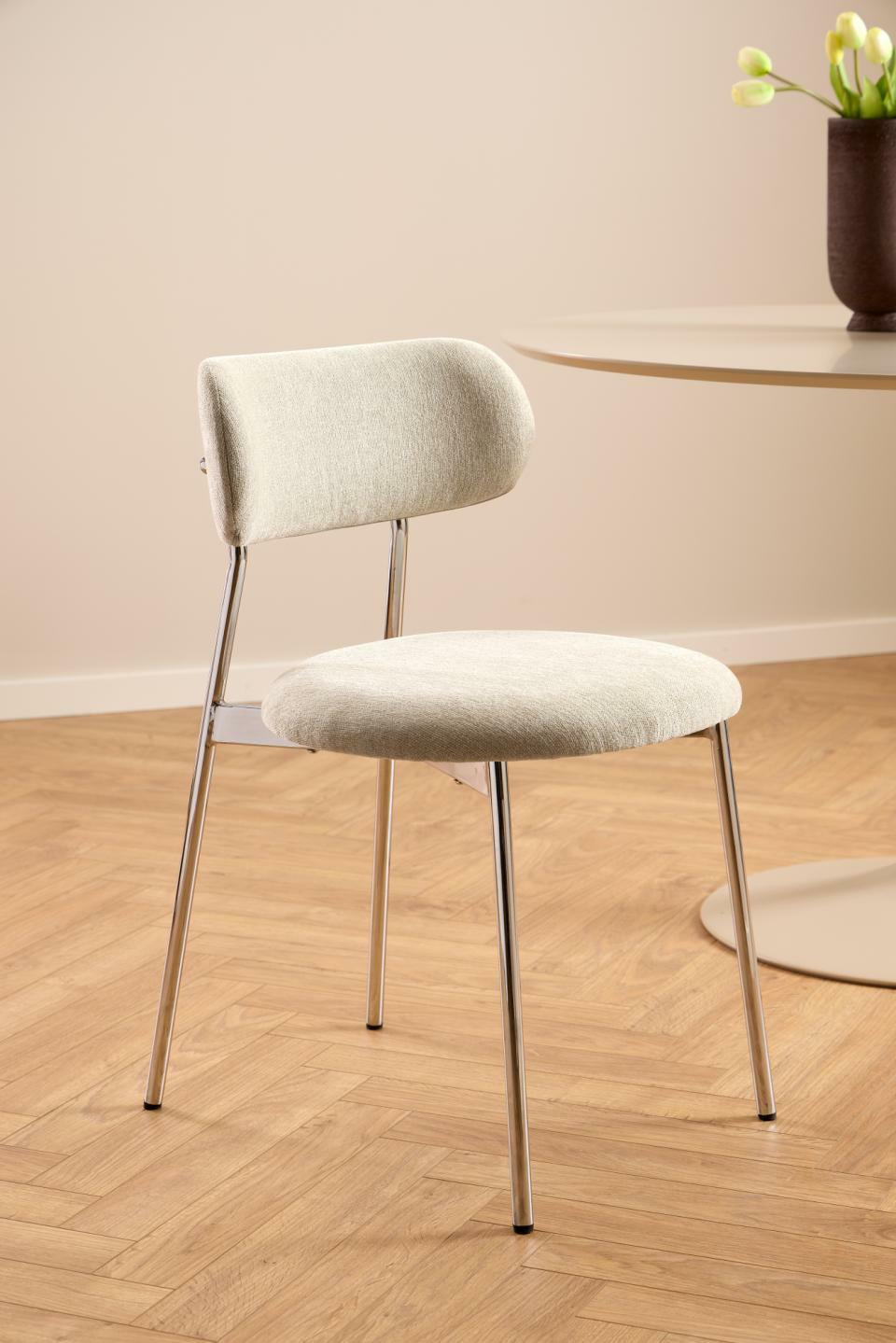 Krzesło Lyric marki Actona to tapicerowane krzesło do jadalni w beżowym kolorze, osadzone na chromowanych nogach. Łączy miękkie, zaokrąglone siedzisko z lekką, metalową podstawą, dzięki czemu świetnie sprawdzi się przy stole w jadalni, kuchni lub w eleganckim kąciku w salonie. Wysokość całkowita 79 cm oraz siedzisko na poziomie 48,5 cm zapewniają wygodną pozycję zarówno do codziennych posiłków, jak i dłuższych spotkań przy stole.