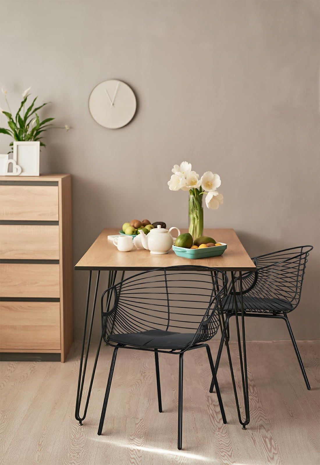 Krzesło wykonane jest z trwałej stali, dzięki czemu z powodzeniem wytrzymuje obciążenie do 110 kg i zachowuje stabilność na co dzień. Cztery nogi tworzą pewną podstawę, co ma znaczenie szczególnie w intensywnie użytkowanych przestrzeniach, takich jak kuchnia czy jadalnia. Metalowa konstrukcja jest łatwa do utrzymania w czystości – wystarczy przetarcie wilgotną ściereczką, aby usunąć ślady codziennego użytkowania.