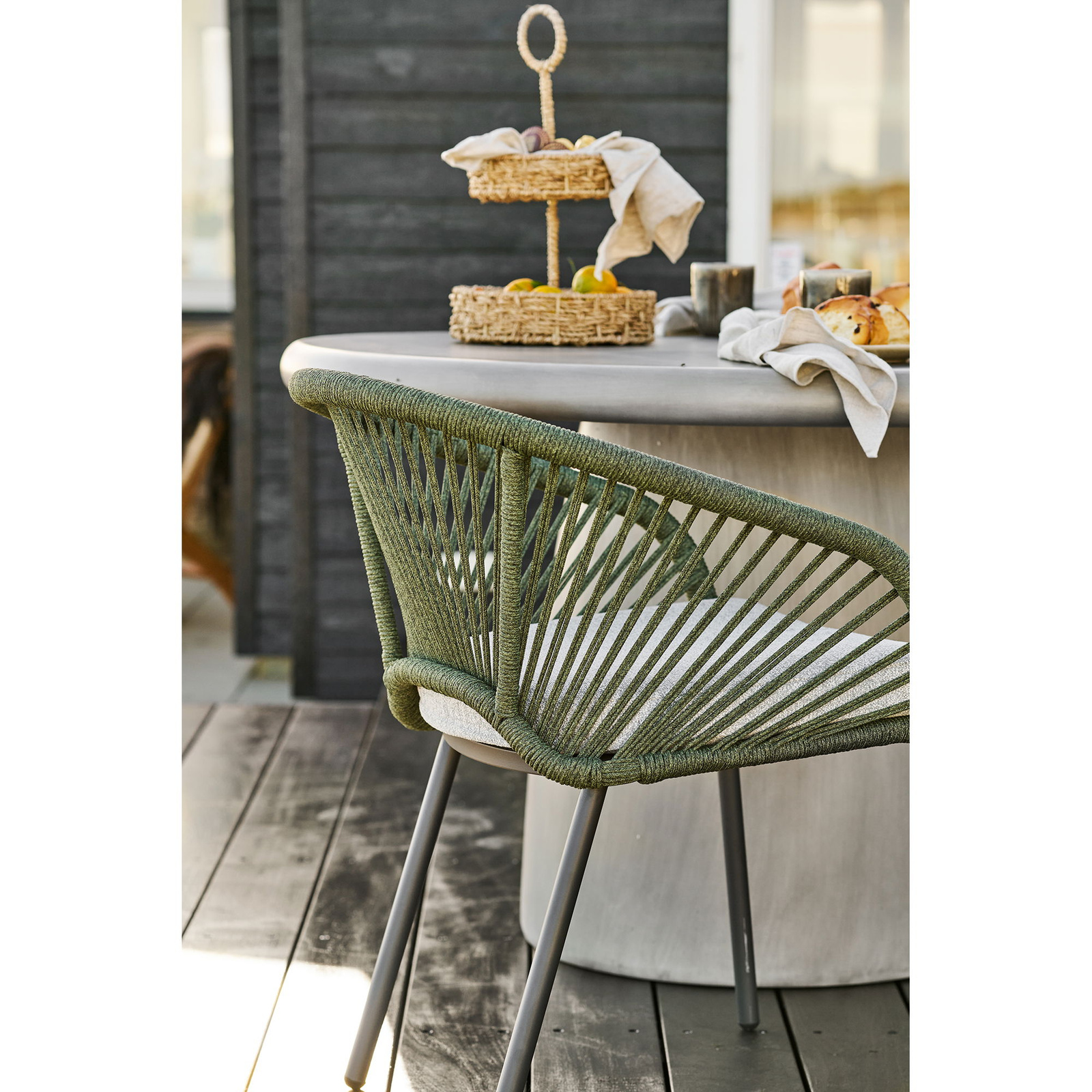 Dzięki połączeniu zielonej ramy z szarym siedziskiem krzesło Novella łatwo dopasować zarówno do drewnianego stołu, jak i nowoczesnego blatu o gładkiej powierzchni. Sprawdzi się jako krzesło do kuchni przy wyspie, jako wygodne miejsce przy stole w salonie czy dodatkowe siedzisko w kąciku do czytania. To propozycja dla osób, które lubią lekki styl boho, ale cenią porządek, funkcjonalność i łatwą aranżację.