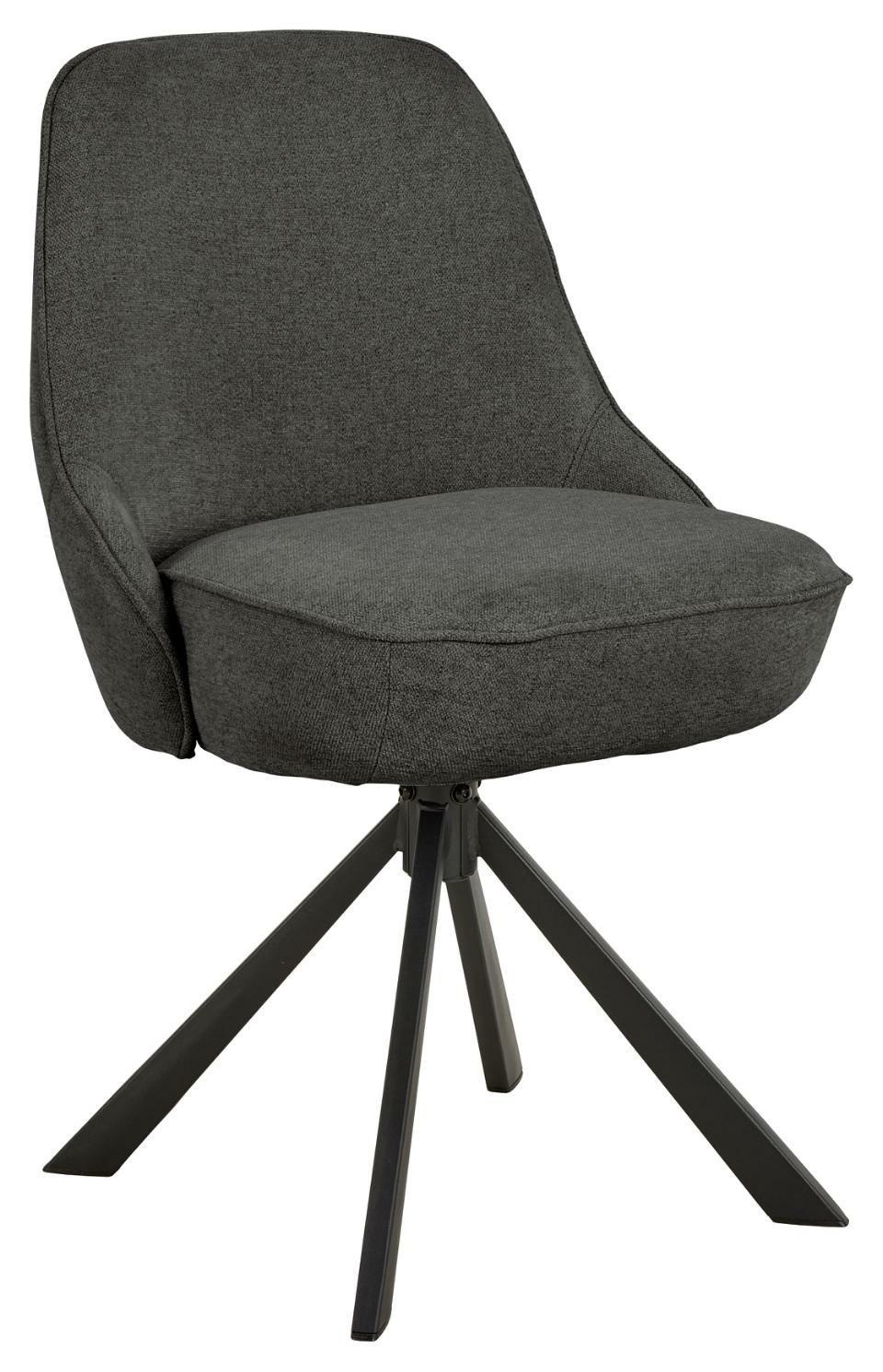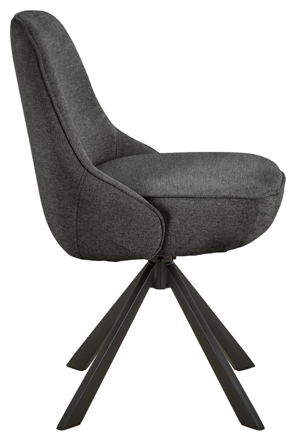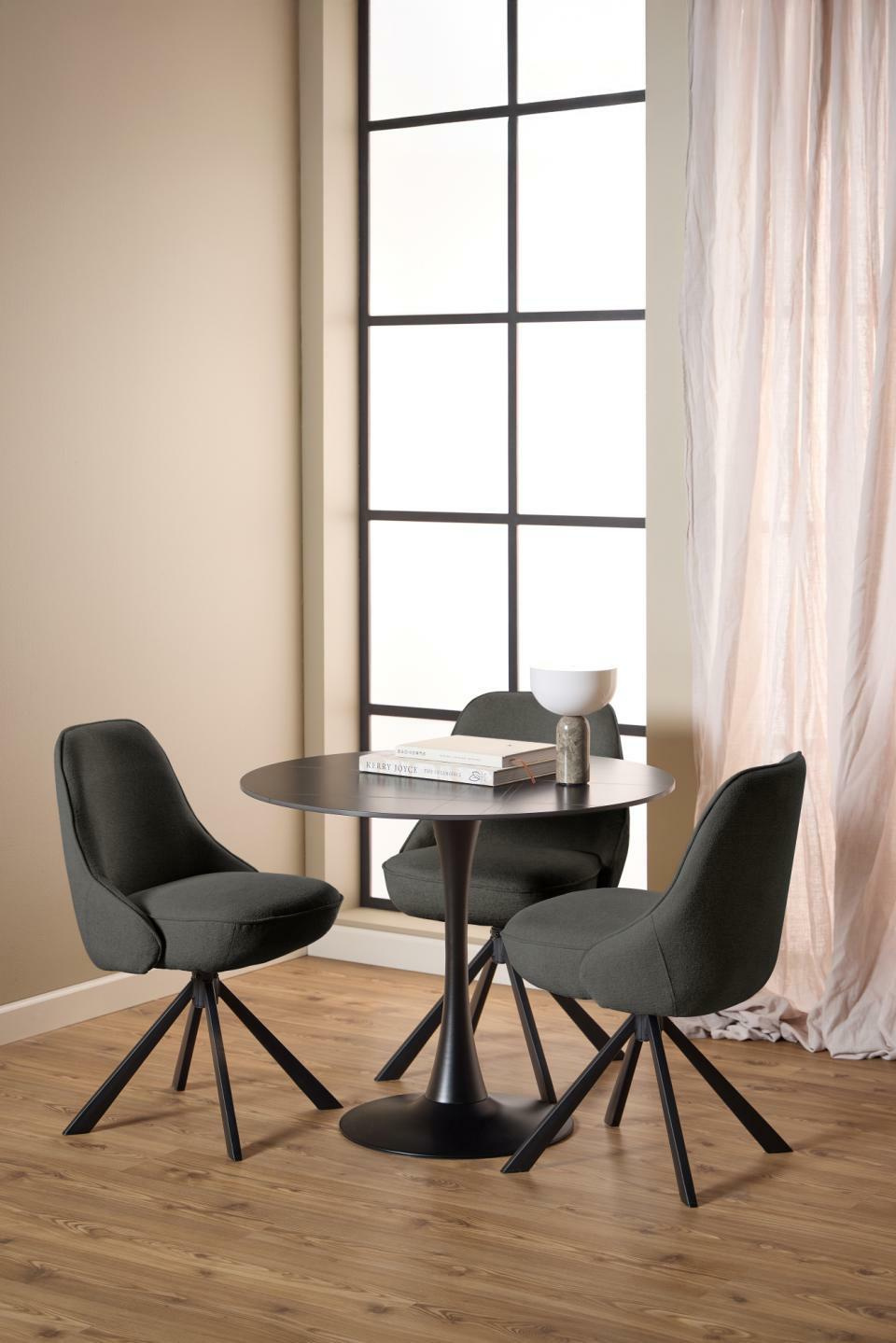 Krzesło tapicerowane Carlton marki Actona to nowoczesne, czarne krzesło obrotowe stworzone z myślą o jadalni i salonie. Komfortowe, miękko wyprofilowane siedzisko z przyjemną w dotyku tkaniną wspiera wygodę przy długich posiłkach, a stabilna metalowa podstawa na czterech nogach zapewnia pewne oparcie nawet przy codziennym, intensywnym użytkowaniu.