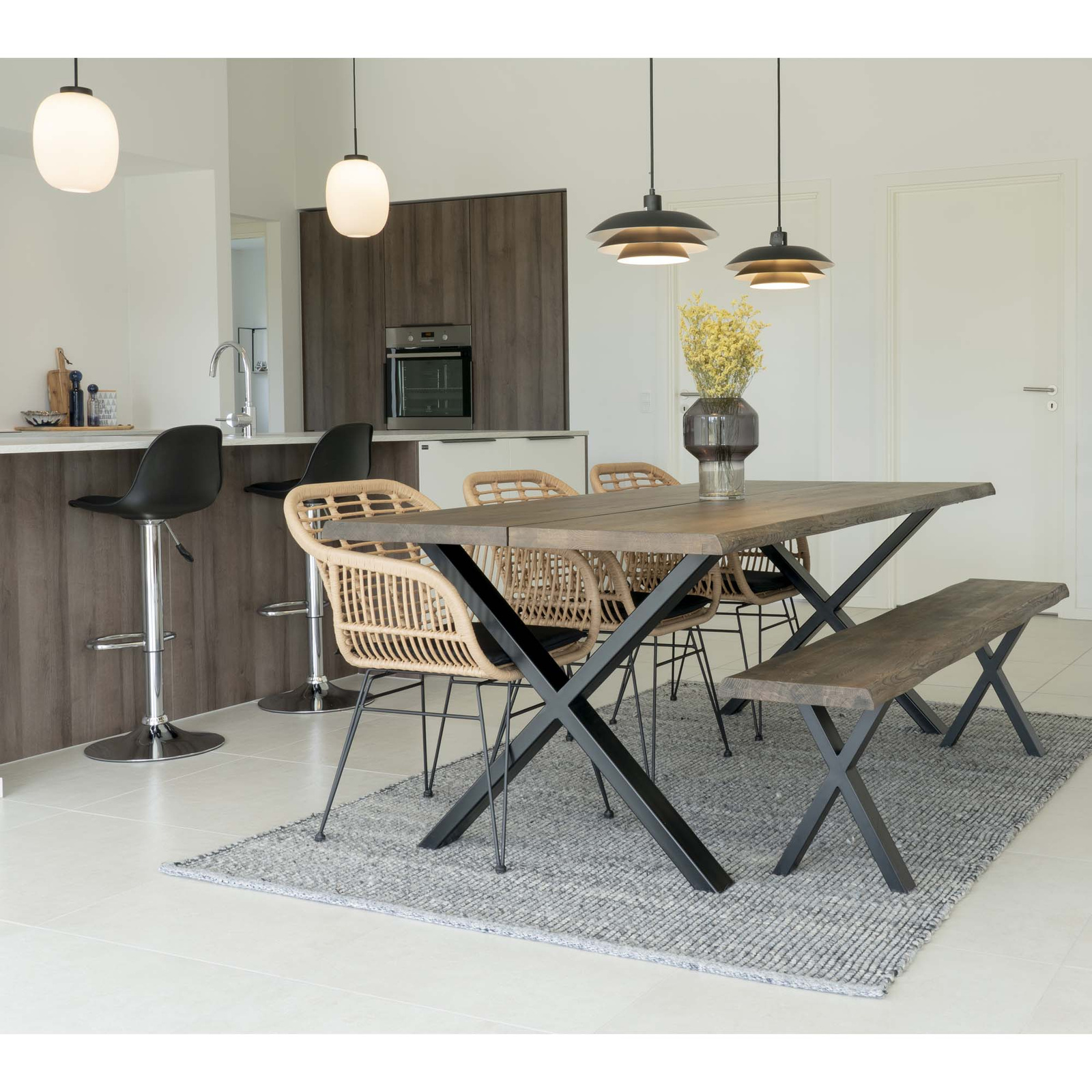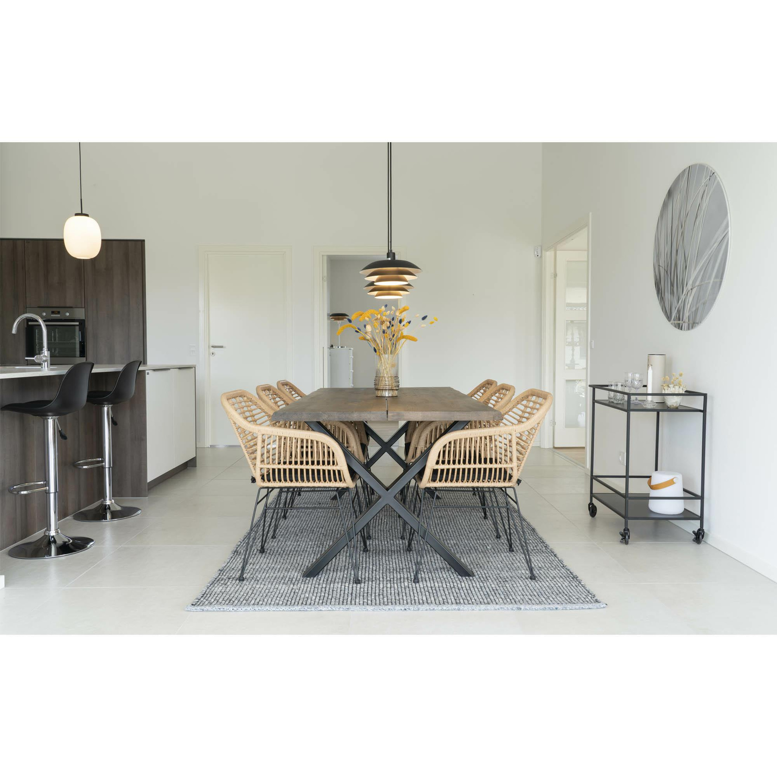 Krzesło do jadalni Trieste jest nie tylko efektowne, ale i praktyczne – wysokość siedziska 43 cm pozwala na wygodne dopasowanie do większości stołów. Zastosowany polirattan jest odporny na zabrudzenia oraz łatwy do utrzymania w czystości, dzięki czemu sprawdzi się także w kuchni czy na tarasie. Cztery stabilne nogi wykonane ze stali zapewniają bezpieczeństwo użytkowania do 110 kg obciążenia, a półmatowe wykończenie dodaje elegancji.