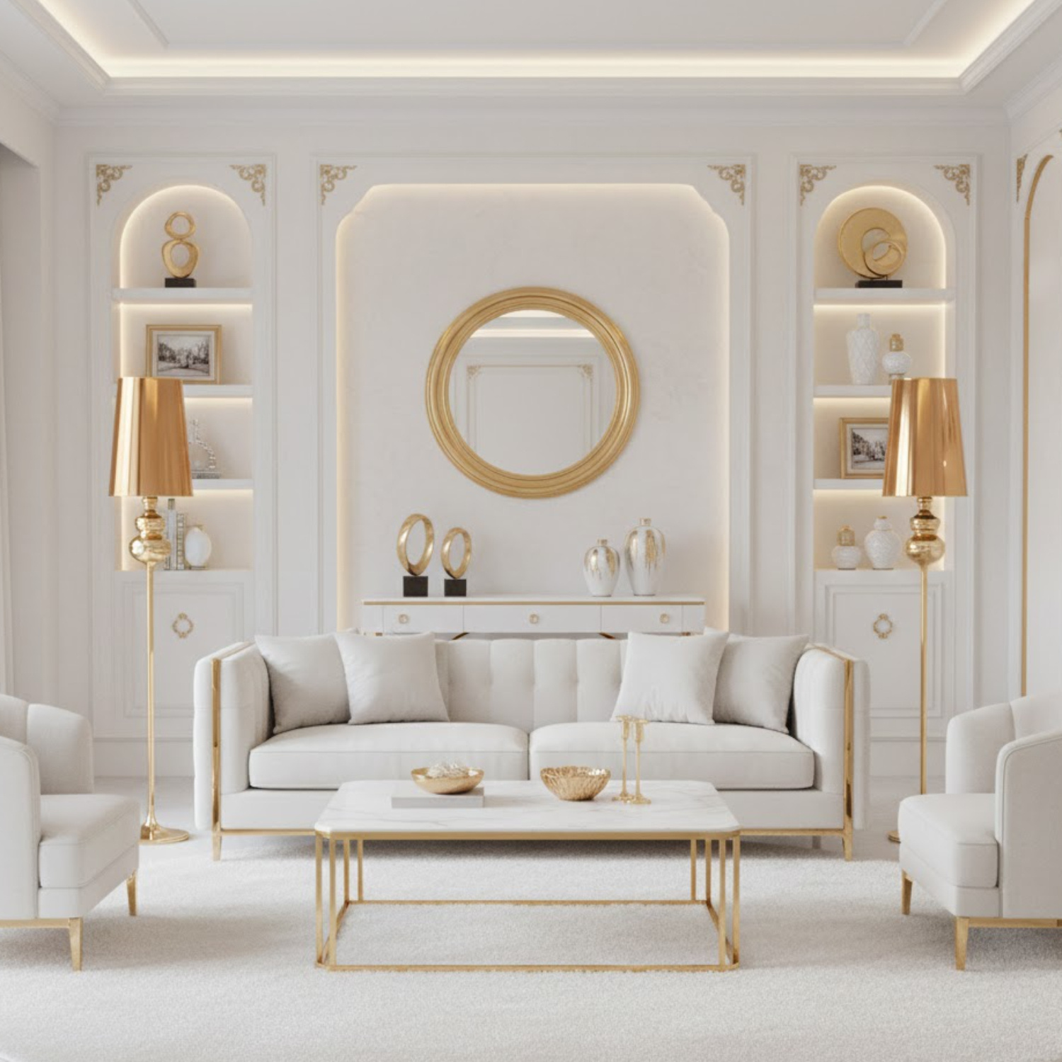 Podstawa lampy QUEEN wykonana została z aluminium w kolorze złotym lustrzanym, a abażur z tworzywa sztucznego w kolorze złotym.