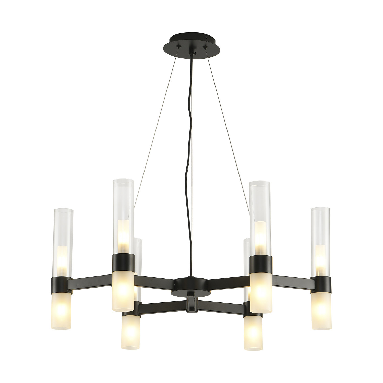 Geometryczny układ ramion i cylindryczne klosze zapewniają równomierne rozproszenie światła w pomieszczeniu.