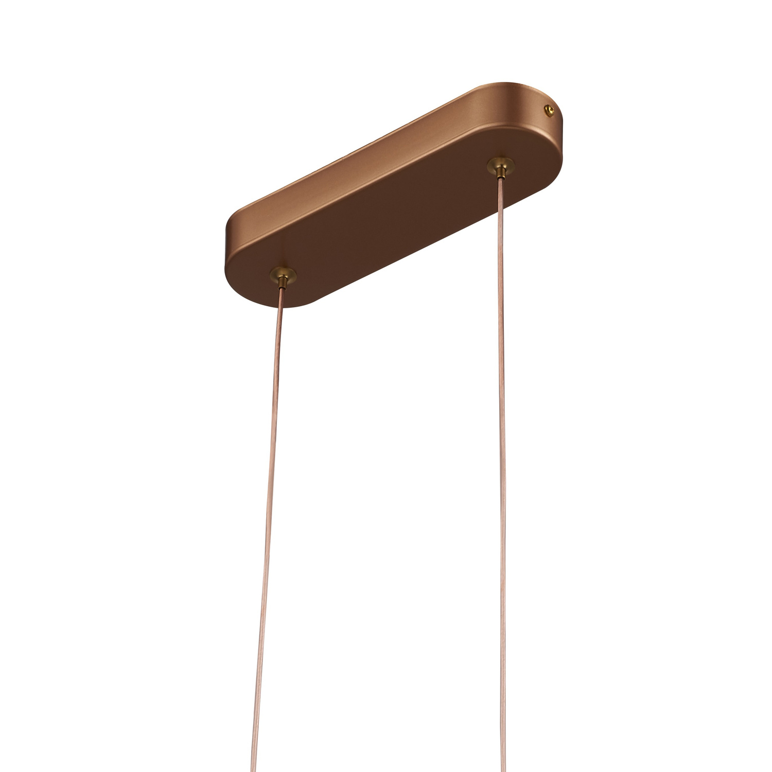 Lampa zawieszona jest na dwóch cienkich linkach w kolorze złotym, przymocowanych do podłużnej, owalnej podsufitki w tym samym odcieniu.