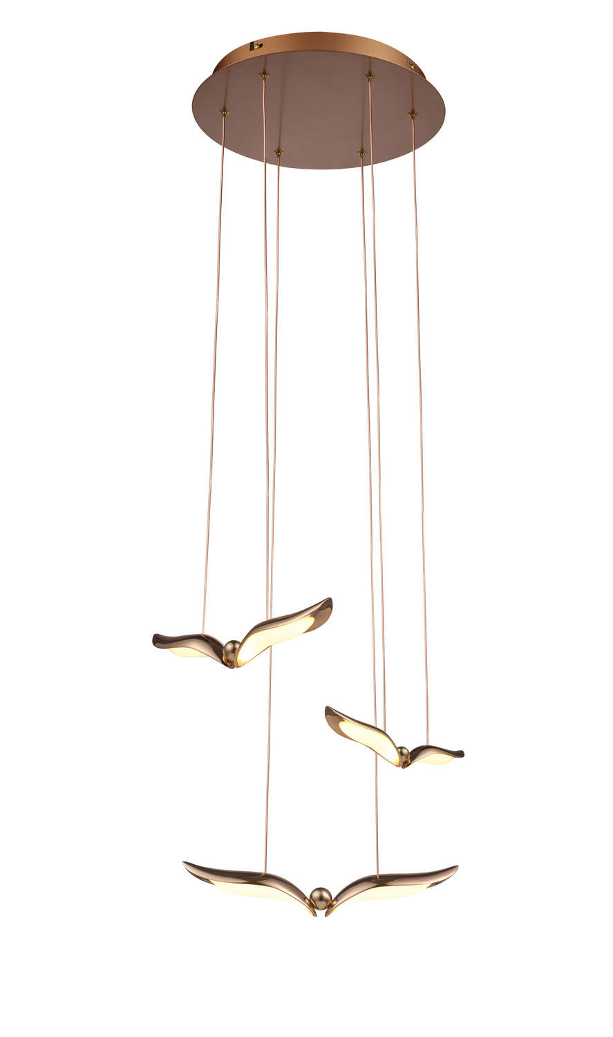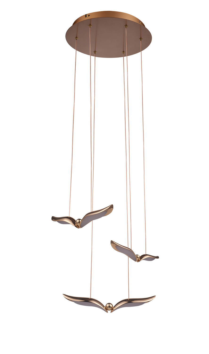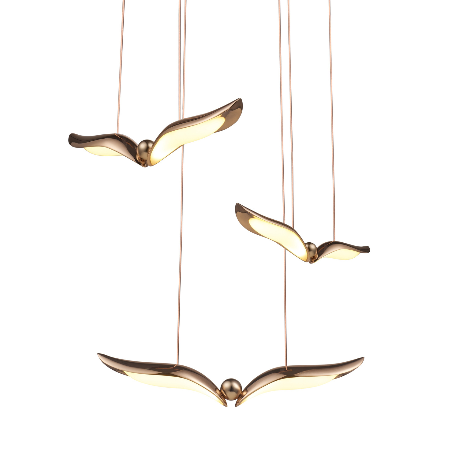 Trzy metalowe ptaki w odcieniu błyszczącego różowego złota tworzą dynamiczną kompozycję inspirowaną ruchem ptaków w locie.