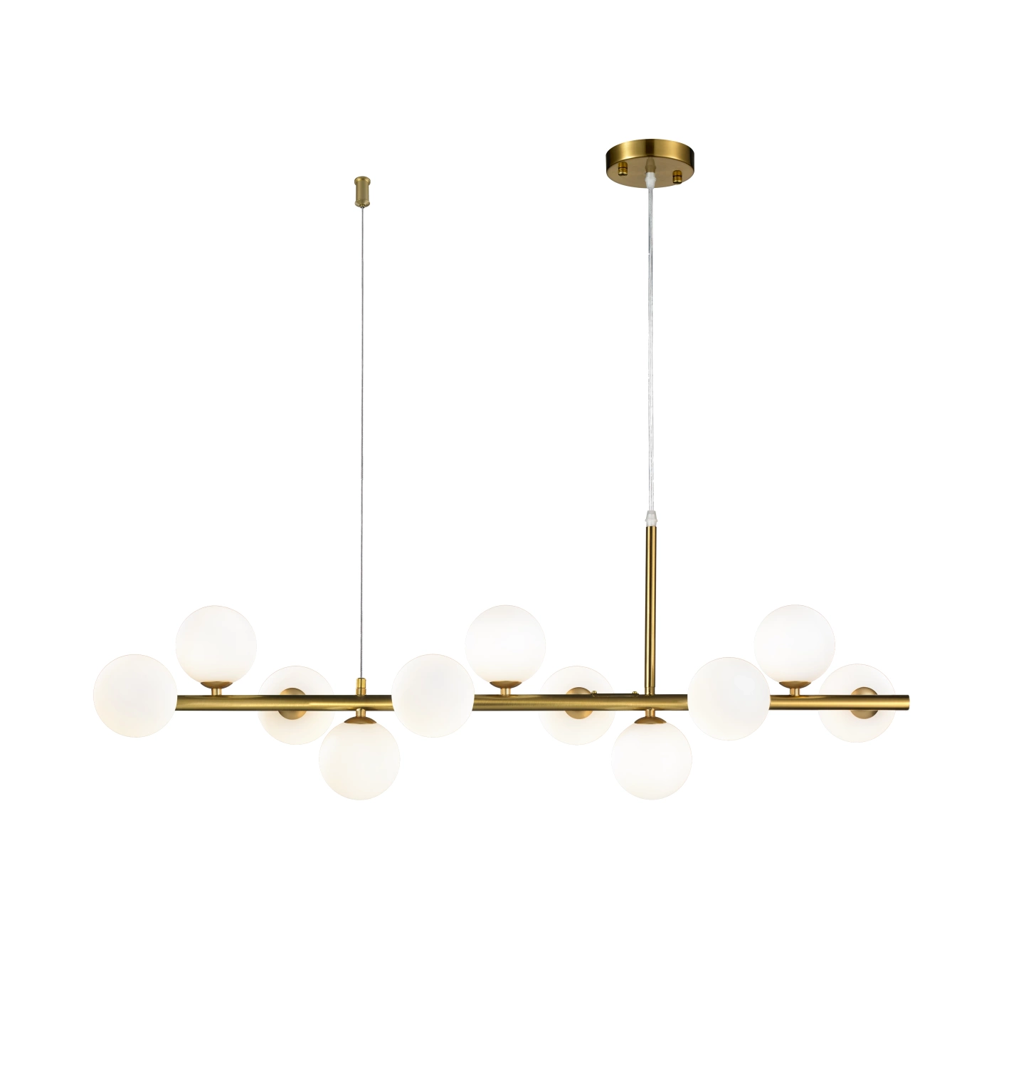 Lampa wisząca Mini Moon złota 100 cm Step Into Design to kwintesencja nowoczesności spotykającej się z subtelną elegancją. Jej linearna, wydłużona forma, złożona z harmonijnie rozmieszczonych, okrągłych kloszy, tworzy wizualną poezję światła i formy. Klosze, symetrycznie rozmieszczone wzdłuż smukłej, metalowej konstrukcji w złotym kolorze, przypominają delikatne księżyce zawieszone w kosmicznym tańcu. Każdy z nich, wykonany z matowego szkła, emituje łagodne, rozproszone światło, idealne do stworzenia atmosfery ciepła i spokoju. Styl, w jakim została wykonana lampa, nawiązuje do minimalistycznej estetyki z nutą glamour, co sprawia, że będzie pasować zarówno do nowoczesnych, jak i bardziej tradycyjnych wnętrz. Doskonale sprawdzi się w roli centralnego punktu oświetleniowego w salonie, jadalni czy nad blatem kuchennym, wprowadzając do każdego z tych pomieszczeń element luksusu i wyrafinowania. Projektanci skierowali ten model do odbiorców ceniących sobie design i funkcjonalność - dla osób poszukujących nie tylko źródła światła, ale i wyjątkowego elementu dekoracyjnego. Kunszt wykonania i ponadczasowy wygląd lampy Mini Moon sprawią, że będzie ona wyrazistym akcentem w każdym pomieszczeniu, jednocześnie pełniąc funkcję praktyczną i estetyczną.