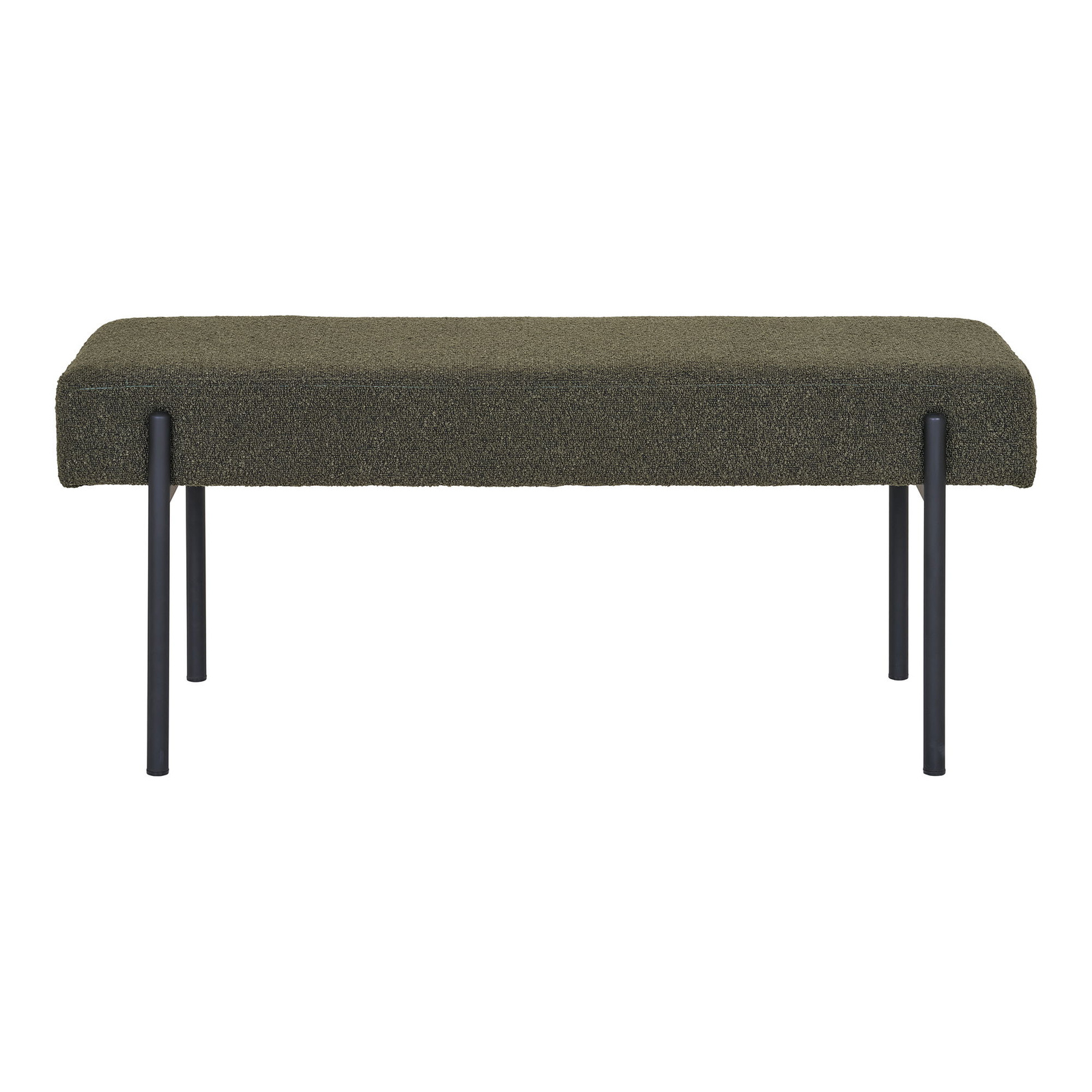 Ławka tapicerowana Swindon boucle zielona marki Intesi to nowoczesny akcent do przedpokoju, salonu lub sypialni. Siedzisko z przyjemnej w dotyku tkaniny boucle w głębokim, zielonym kolorze osadzone jest na smukłych, czarnych nogach ze stali, co tworzy harmonijne połączenie wygody i minimalistycznego stylu. Dzięki szerokości 100 cm i głębokości 36 cm ławka bez trudu zagospodaruje przestrzeń w wąskim korytarzu, pod oknem lub przy stole, oferując komfortowe miejsce dla trzech osób.