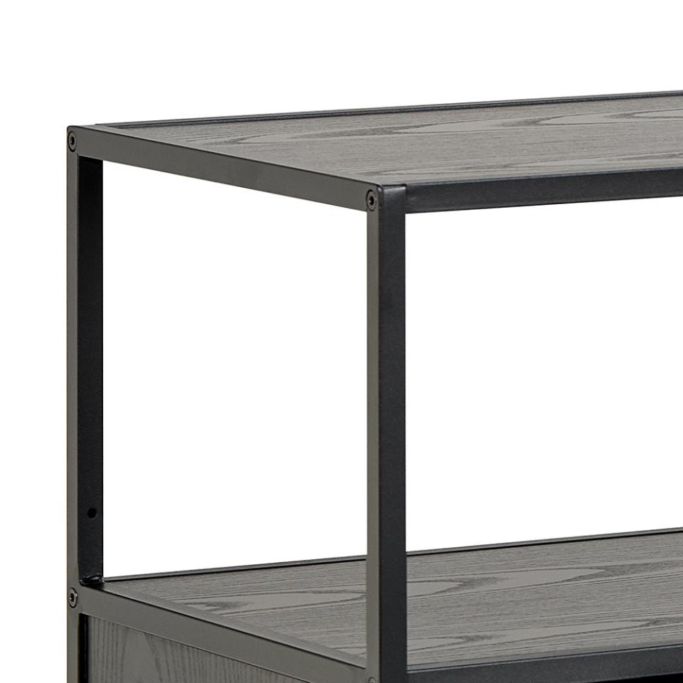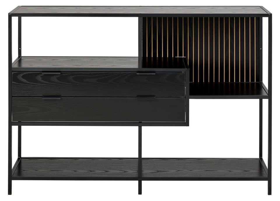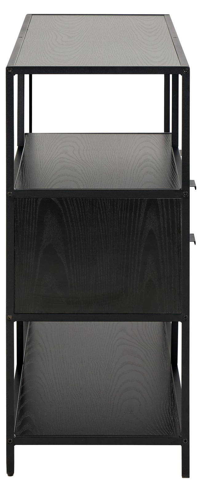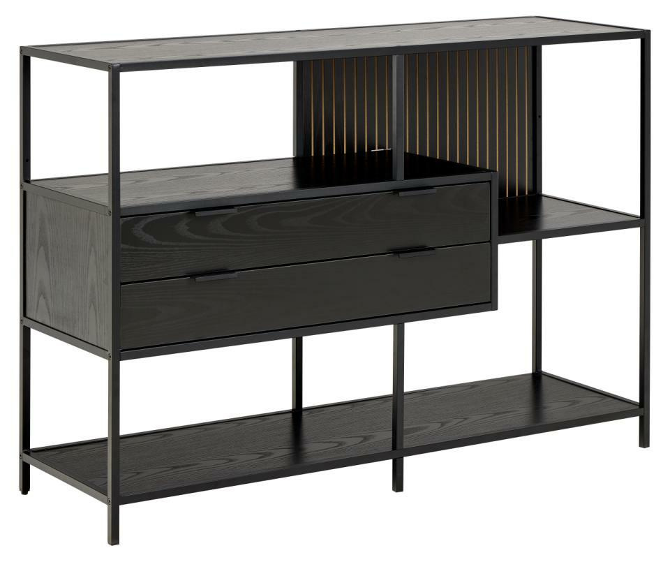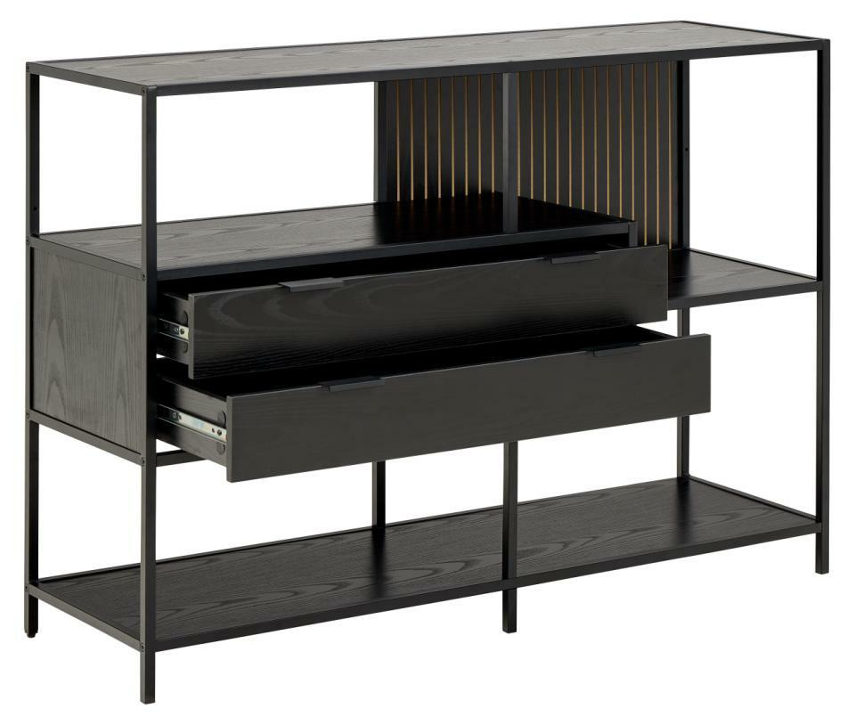 Regał loftowy Seaford V marki Actona to kompaktowy regał na książki z czarnym wykończeniem jesionu, wyposażony w 3 otwarte półki i 4 praktyczne szuflady. Stabilna, metalowa konstrukcja o szerokości 114 cm i wysokości 78 cm świetnie sprawdzi się w salonie, biurze, przedpokoju czy pokoju młodzieżowym jako funkcjonalny regał loftowy do przechowywania i ekspozycji.