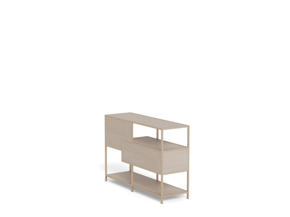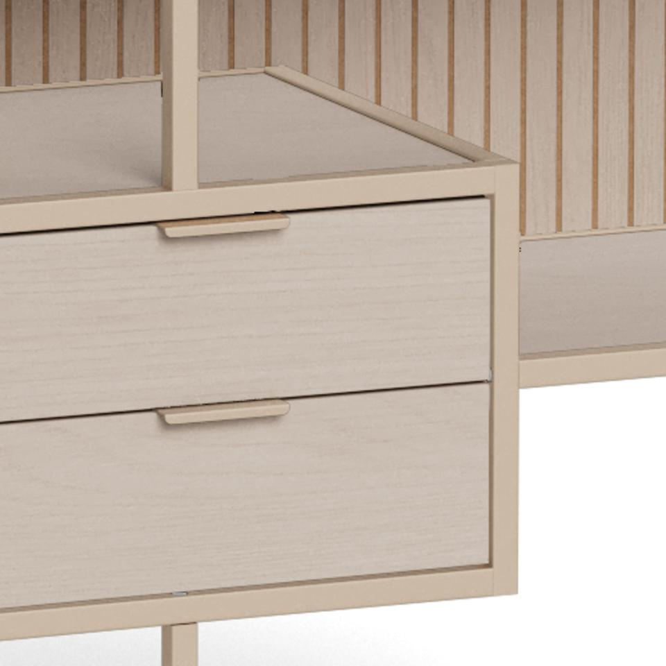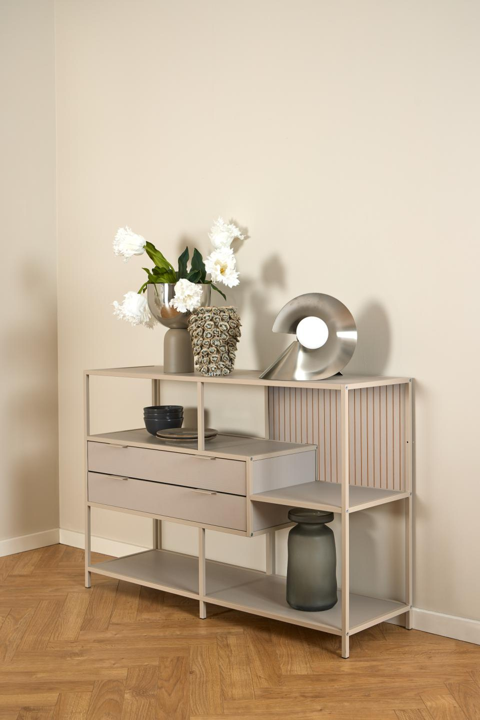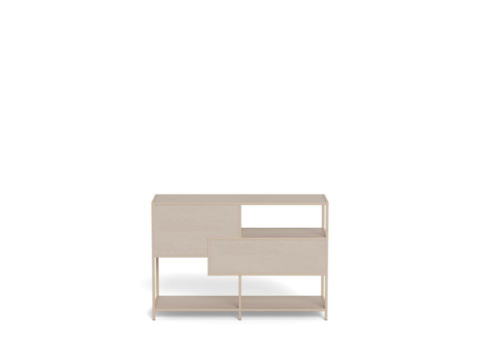 Regał loftowy Seaford V marki Actona to kompaktowy regał na książki z szufladami o wymiarach 114 × 35 × 78 cm, wykonany z połączenia beżowej stali i płyty meblowej w półmacie. Dzięki trzem otwartym półkom i dwóm praktycznym szufladom łączy funkcję reprezentacyjnego regału do salonu z wygodnym miejscem na drobiazgi, dokumenty czy akcesoria.