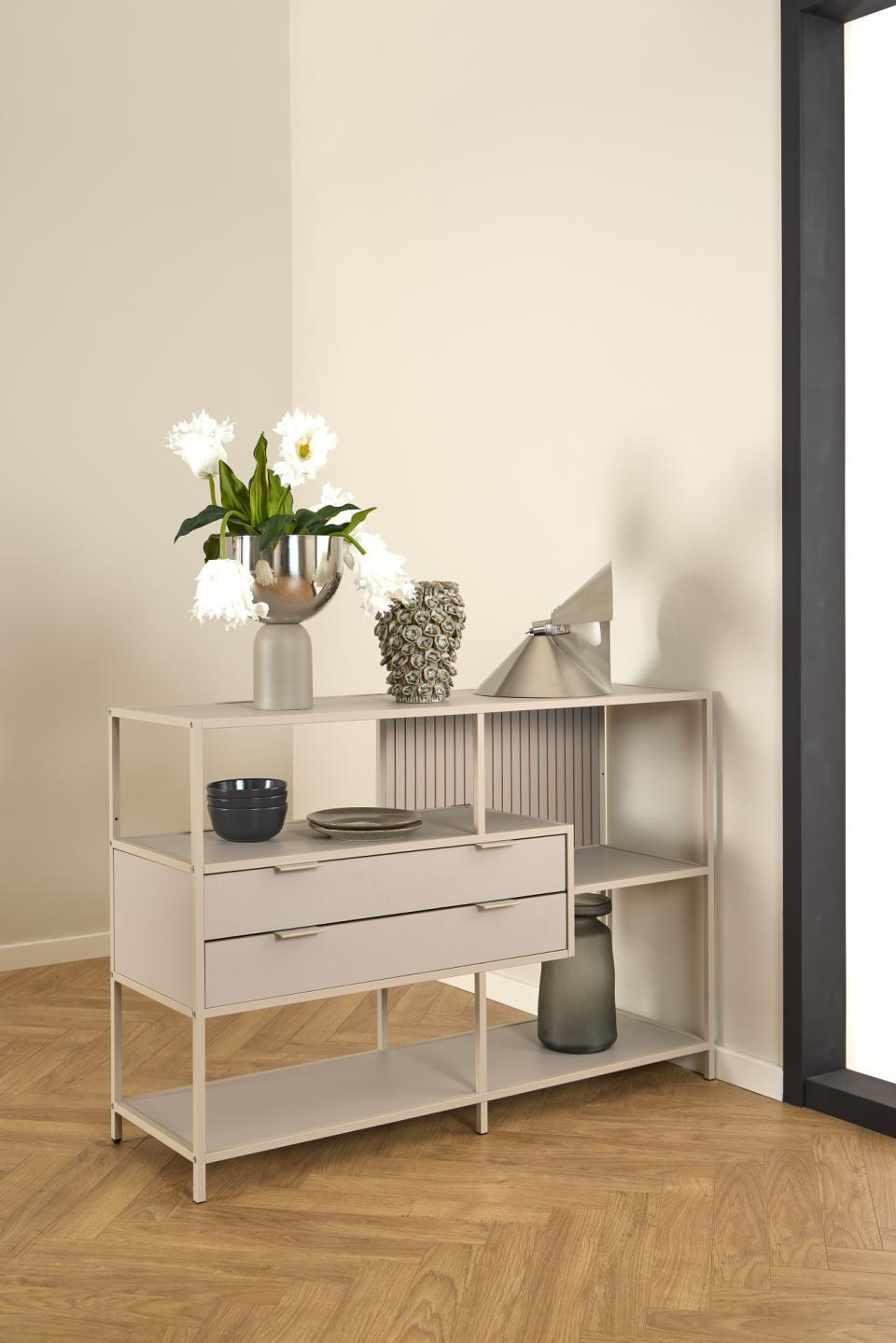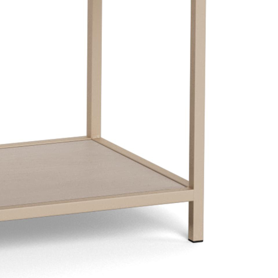 Minimalistyczna, beżowa konstrukcja na czterech smukłych nogach nadaje meblowi lekkości, dzięki czemu nie przytłacza wnętrza, nawet w mniejszych pomieszczeniach. Otwarty układ trzech półek sprawia, że regał doskonale sprawdzi się jako regał na książki, dekoracje, ramki ze zdjęciami czy rośliny doniczkowe. Wysokość 78 cm ułatwia aranżację pod oknem, obok sofy lub biurka, tworząc spójną, uporządkowaną przestrzeń.