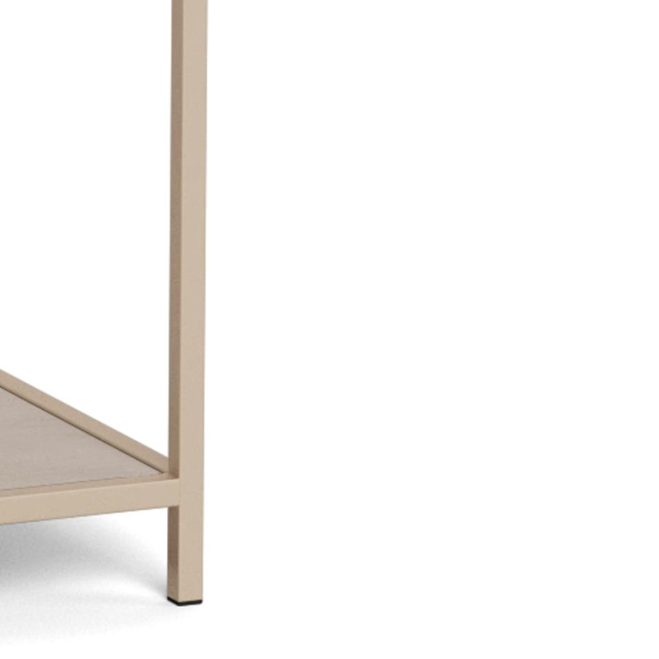 Beżowy kolor regału i metalowej ramy w półmatowym wykończeniu doskonale wpisuje się w nowoczesne i loftowe aranżacje. Stalowa podstawa na czterech nogach zapewnia stabilność, a jednocześnie wygląda lekko – regał nie sprawia wrażenia masywnego mebla, nawet przy pełnym obciążeniu. Połączenie metalu z płytą pokrytą melaminą oznacza powierzchnię łatwą w czyszczeniu – kurz wystarczy przetrzeć wilgotną ściereczką, bez konieczności stosowania specjalnych preparatów.