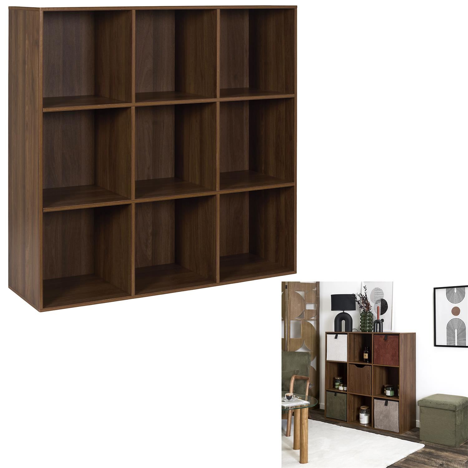 Korpus regału wykonano z wytrzymałej płyty, pokrytej okleiną w kolorze ciemnego orzecha. Taka konstrukcja zapewnia dobrą stabilność przy stosunkowo niewielkiej wadze całkowitej 22,8 kg, dzięki czemu bez trudu przeniesiesz mebel podczas przemeblowania. Półmatowe wykończenie ułatwia utrzymanie regału w czystości – kurz nie jest mocno widoczny, a powierzchnię wystarczy przetrzeć miękką ściereczką.