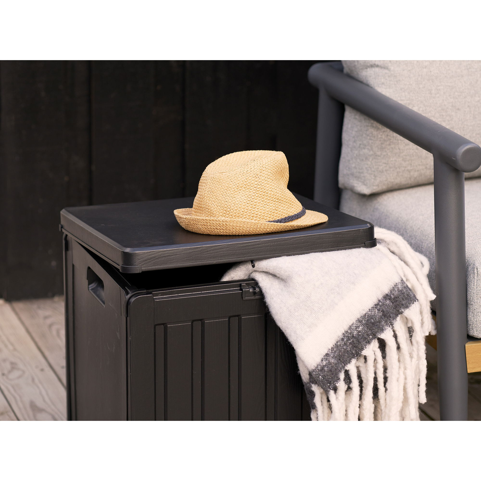 Ta kompaktowa skrzynia ogrodowa została zaprojektowana z myślą o codziennym użytkowaniu w strefie relaksu na świeżym powietrzu. Pojemność 76 l sprawia, że bez problemu pomieści poduszki do zestawu mebli na taras, niewielki pled czy akcesoria ogrodowe, jednocześnie nie zajmując wiele miejsca. Dzięki zgrabnym wymiarom skrzynia świetnie sprawdzi się także jako schowek na mały balkon, gdzie każdy centymetr przestrzeni ma znaczenie. Prosta, czarna forma łatwo wkomponuje się zarówno w nowoczesne, jak i bardziej klasyczne aranżacje wypoczynkowe.