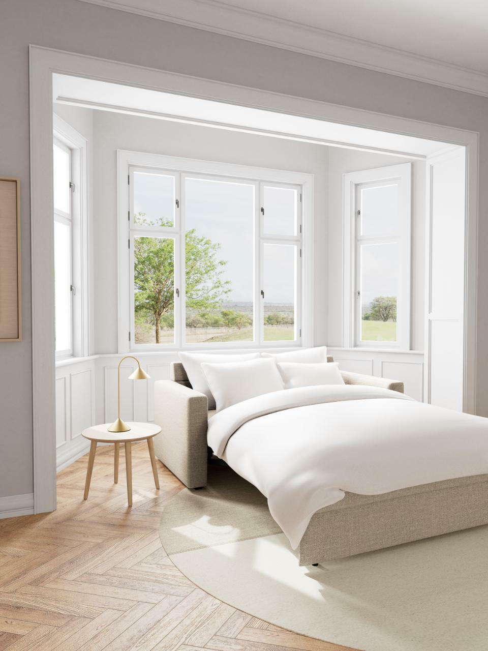 Fleury to sofa rozkładana zaprojektowana z myślą o codziennym użytkowaniu. Wysokie, komfortowe siedzisko (47,5 cm) ułatwia wstawanie, a podłokietniki na wysokości 65 cm wygodnie podtrzymują ramiona podczas czytania czy pracy z laptopem. Po rozłożeniu otrzymujesz obszerną strefę snu 205×147 cm – wystarczającą, by komfortowo przenocować dwie osoby, bez uczucia „składanej kanapy”.