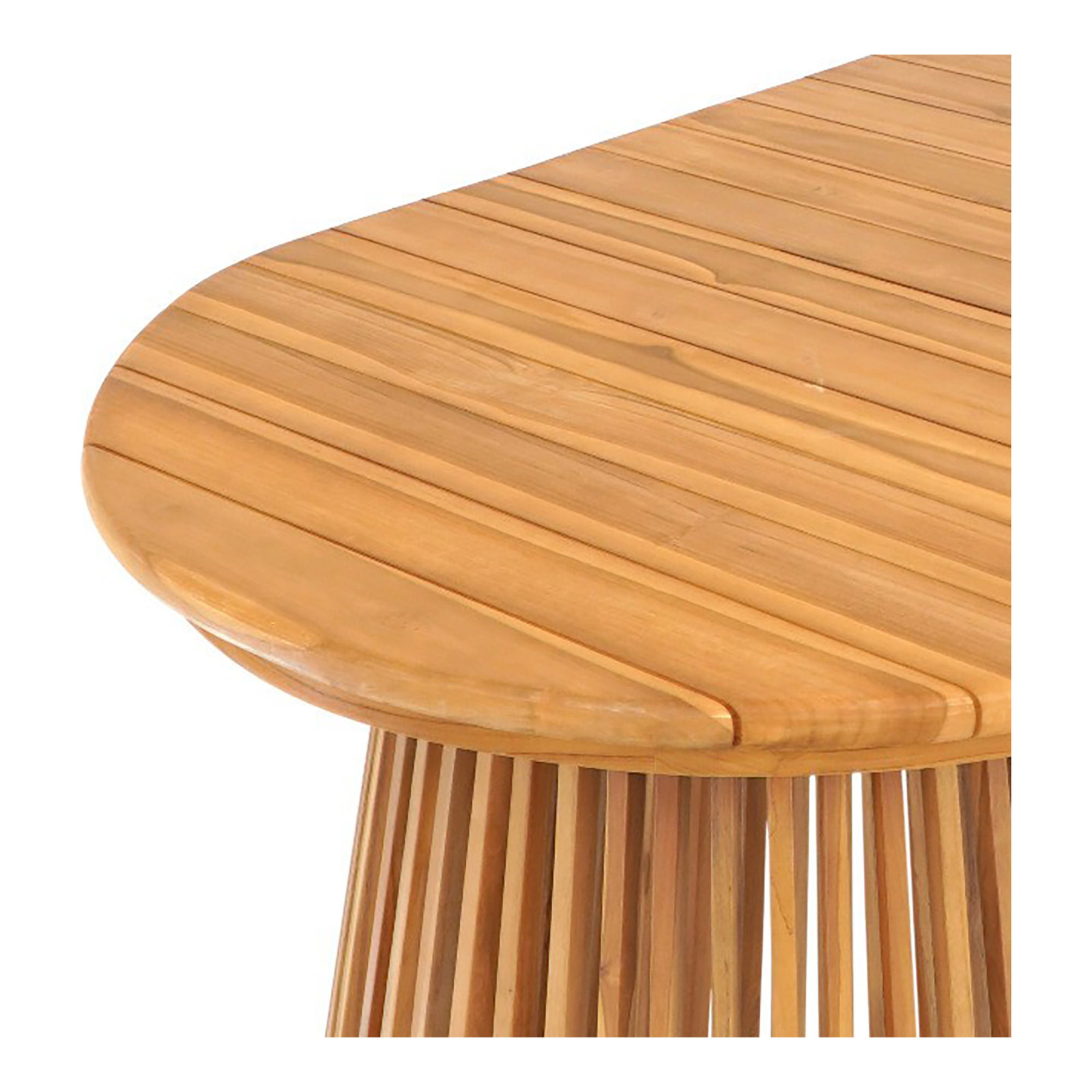 Blat i podstawa wykonane są w całości z drewna tekowego, znanego z wyjątkowej trwałości i szlachetnego wyglądu. To mebel, który z czasem pięknie „dojrzewa”, zachowując swój urok na lata. Owalny kształt stołu sprzyja swobodnej komunikacji – każdy ma do siebie bliżej, a brak ostrych kantów nadaje wnętrzu miękkości i bezpieczeństwa, co docenią zwłaszcza rodziny z dziećmi.