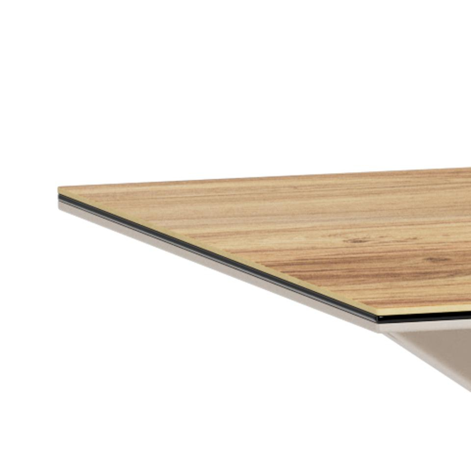 Blat stołu Heaven wykonano z połączenia ceramiki i szkła, co przekłada się na wysoką odporność na użytkowanie w codziennych warunkach. Powierzchnia jest twarda, stabilna i przystosowana do codziennych posiłków, domowych przyjęć czy pracy przy komputerze. Jednocześnie ceramika odwzorowuje strukturę drewna w kolorze naturalnego dębu, dzięki czemu otrzymujesz ciepły efekt wizualny bez konieczności wymagającej pielęgnacji litego drewna.