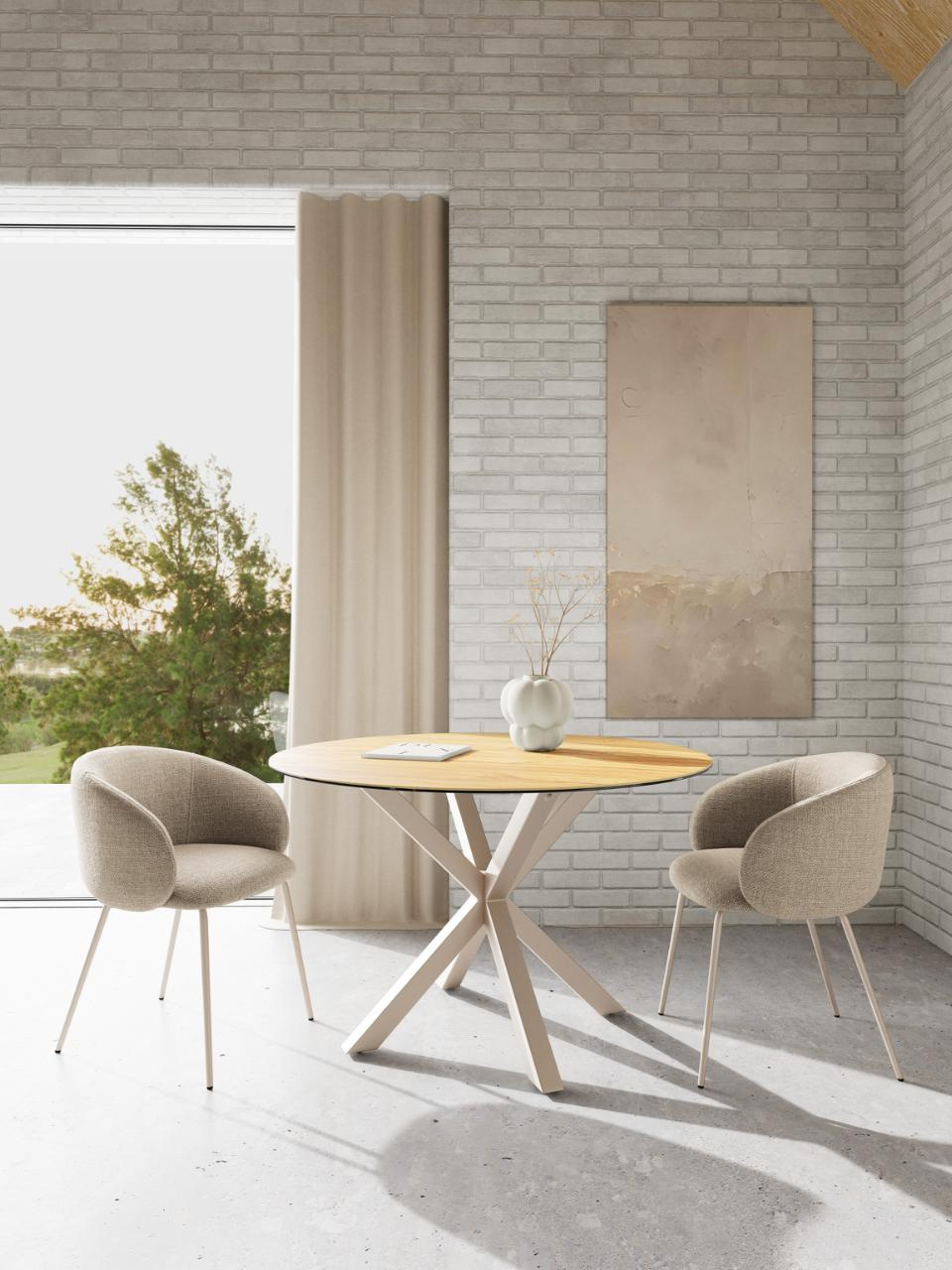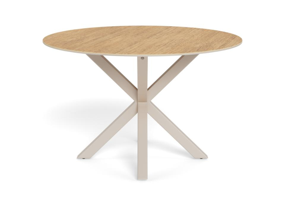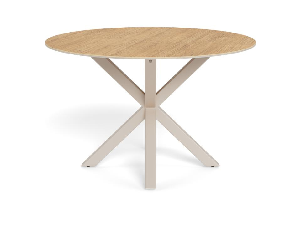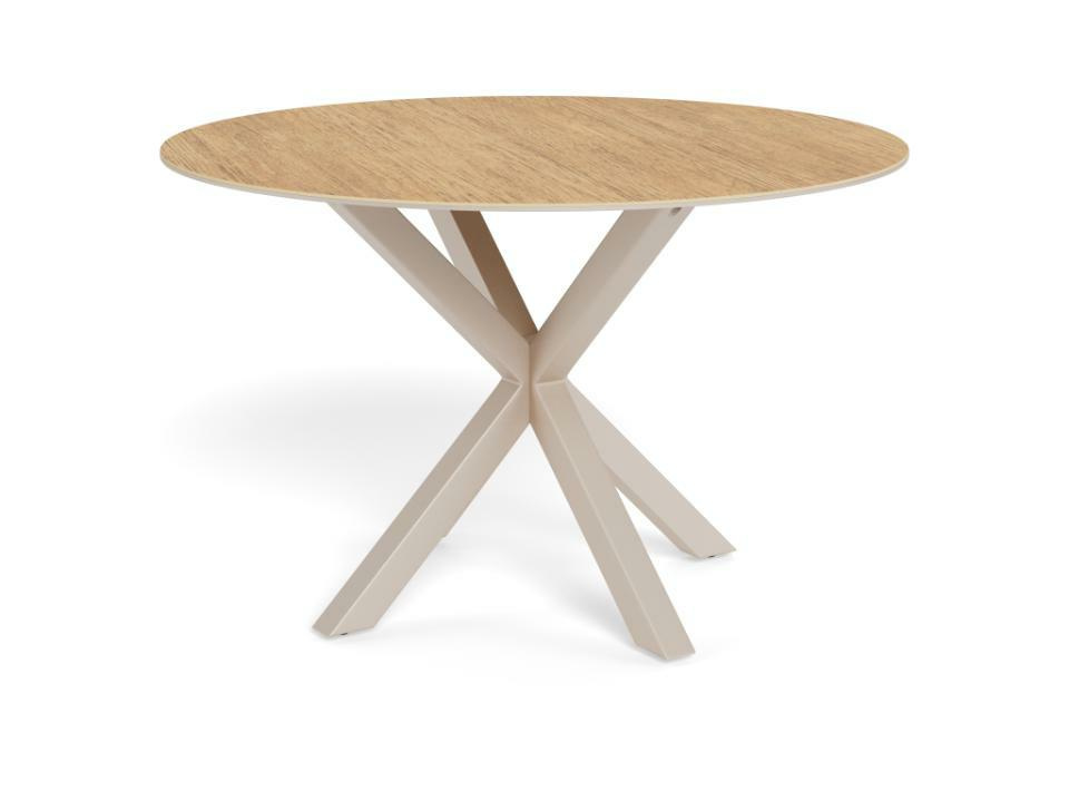 Stół okrągły Heaven marki Actona to nowoczesny stół do jadalni o średnicy 119 cm, łączący matowy blat w dekorze naturalnego dębu kaszmir z solidną, metalową podstawą w beżowym kolorze. Stabilna, czteroramienna konstrukcja i wytrzymały blat z ceramiki na szkle zapewniają komfortowe miejsce dla 4 osób, idealne do codziennych posiłków i spotkań z bliskimi.