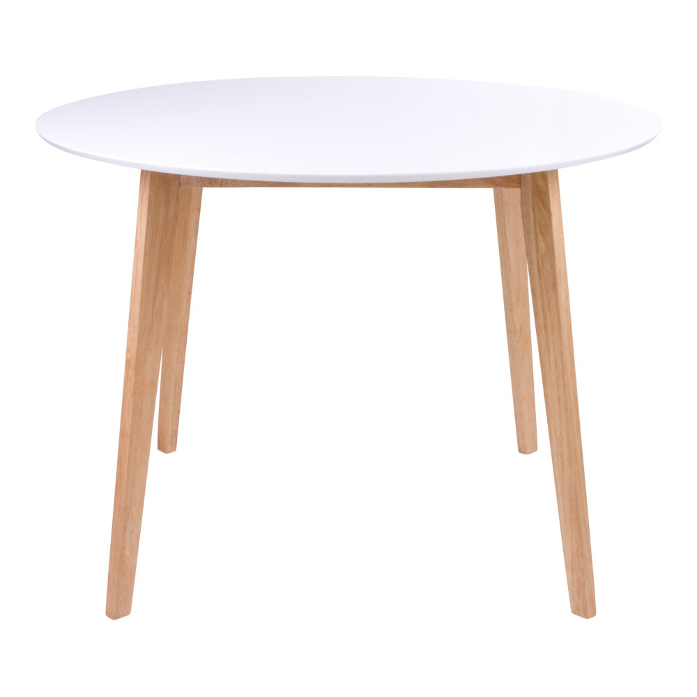 Stół okrągły Vojens utrzymany jest w nowoczesnym stylu, który doskonale wpisuje się w jasne, uporządkowane wnętrza. Biały, półmatowy blat subtelnie odbija światło, dzięki czemu optycznie rozjaśnia kuchnię lub salon. Naturalny kolor drewnianej podstawy dodaje całości przytulności i ciepła, tworząc harmonijne połączenie pasujące zarówno do nowoczesnych, jak i klasycznych aranżacji.