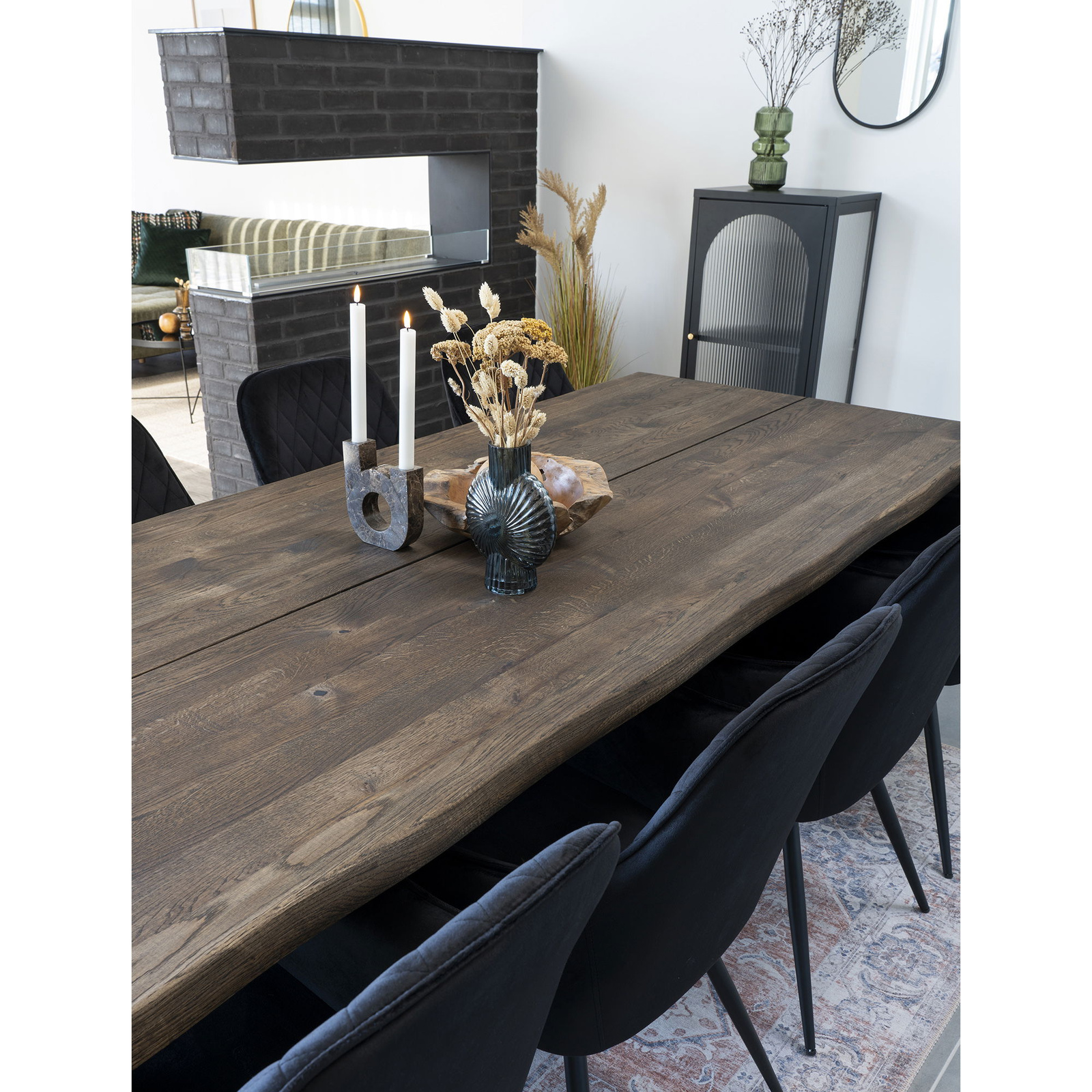 Dymiony blat z drewna dębowego nadaje stołowi wyrazisty, szlachetny charakter. Ciepły, brązowy odcień i widoczne usłojenie wprowadzają do wnętrza przytulność, której często brakuje w nowoczesnych aranżacjach. Prosta forma prostokątnego blatu doskonale komponuje się z czarnymi, metalowymi nogami, tworząc wyrazisty stół loftowy idealny do jadalni, kuchni otwartej na salon czy nowoczesnego apartamentu.