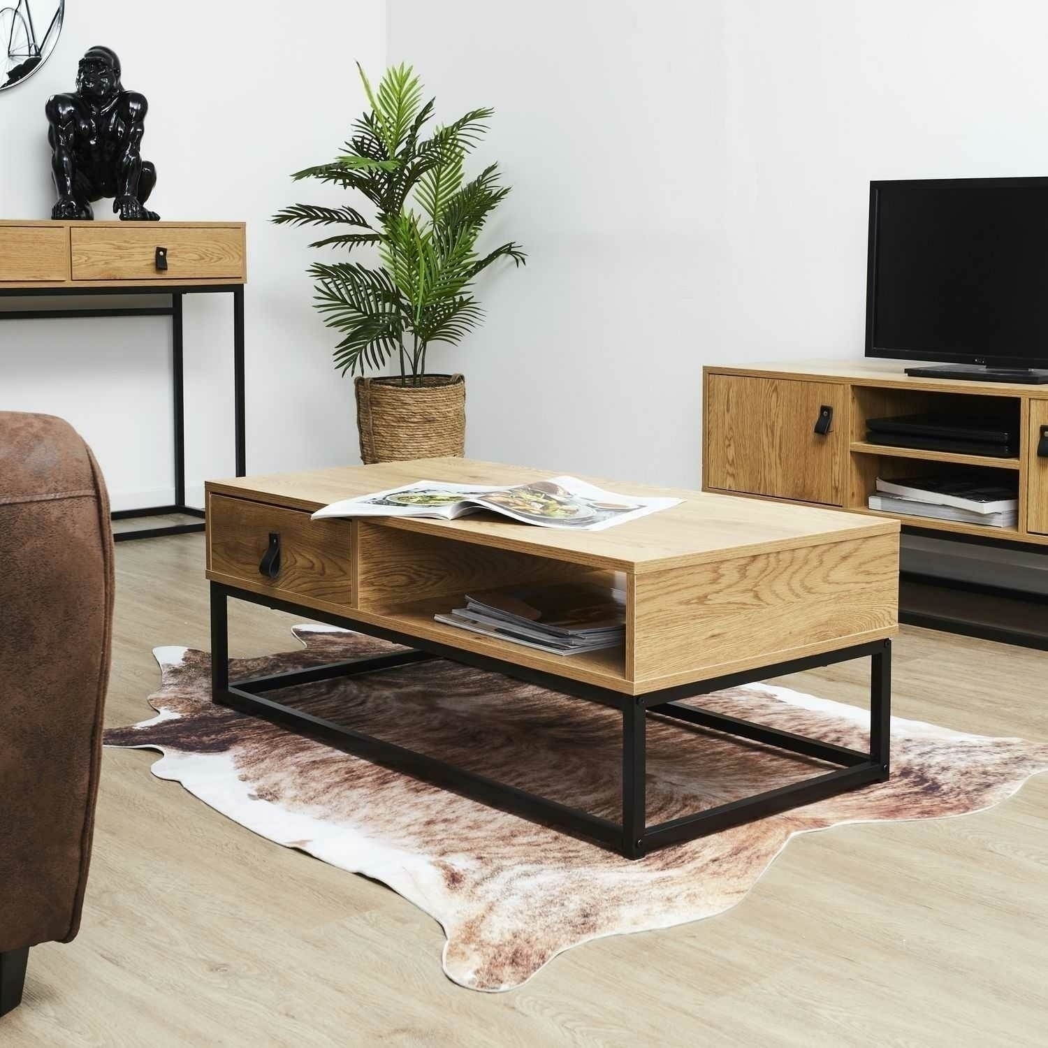 Stolik Abbott dąb/czarny od Intesi to kwintesencja nowoczesnego designu wzbogaconego nutą industrialnego charakteru. Jego prosta, ale efektowna bryła składa się z szerokiego, prostokątnego blatu o ciepłym odcieniu dębu, który wyraźnie kontrastuje z minimalistyczną, metalową podstawą w kolorze głębokiej czerni. Blat, wykończony z dbałością o każdy szczegół, pokazuje naturalne usłojenie drewna, co dodaje meblowi unikatowego charakteru. Stolik wyposażony jest w praktyczną szufladę oraz otwartą półkę, co czyni go nie tylko elementem dekoracyjnym, ale także funkcjonalnym dodatkiem do każdego wnętrza. Szuflada, z subtelnie wbudowanym uchwytem, umożliwia przechowywanie drobnych przedmiotów, podczas gdy półka służy jako miejsce na książki czy czasopisma. Idealnie sprawdzi się w salonie lub pokoju dziennym, gdzie może pełnić rolę centrum rozrywkowego lub eleganckiego stolika kawowego. Jego uniwersalne wzornictwo doskonale odnajdzie się w różnorodnych aranżacjach, od loftów po mieszkania urządzone w duchu skandynawskim czy minimalistycznym. Mebel ten jest dedykowany osobom ceniącym sobie prostotę formy, jak i te szukające praktycznych rozwiązań bez kompromisu w kwestii estetyki.