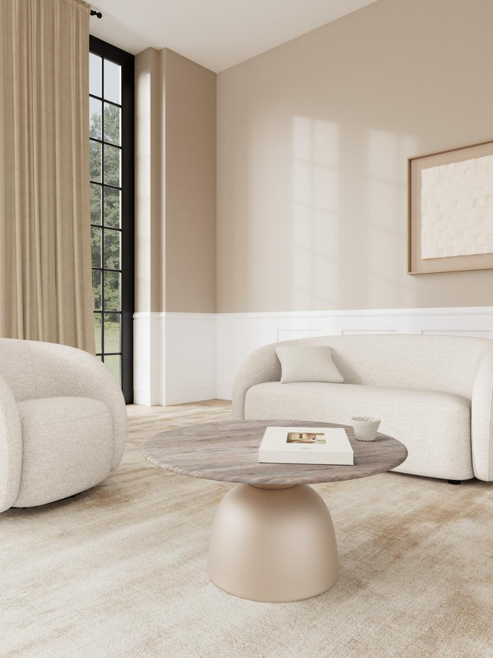 Stalowa podstawa w formie pojedynczej nogi zapewnia wizualną lekkość i pozwala komfortowo wsunąć nogi lub puf pod stolik. Mimo minimalistycznej formy całość prezentuje się solidnie i stabilnie, dzięki czemu Ferrol sprawdzi się zarówno jako centralny stolik kawowy do salonu, jak i elegancki stolik pomocniczy w biurze czy gabinecie.